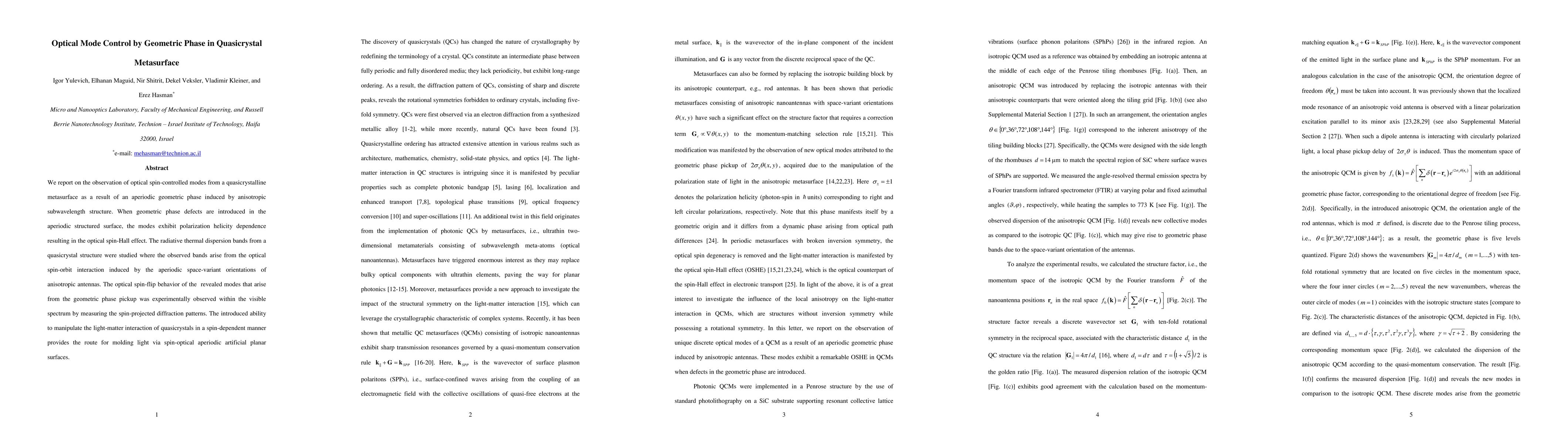 This paper demonstrates the control of optical modes using geometric phase in quasicrystalline metasurfaces, revealing spin-dependent light-matter interactions and the optical spin-Hall effect due to aperiodic geometric phase defects. The study experimentally observes spin-flip behavior in the visible spectrum, paving the way for advanced light manipulation through spin-optical quasicrystals.