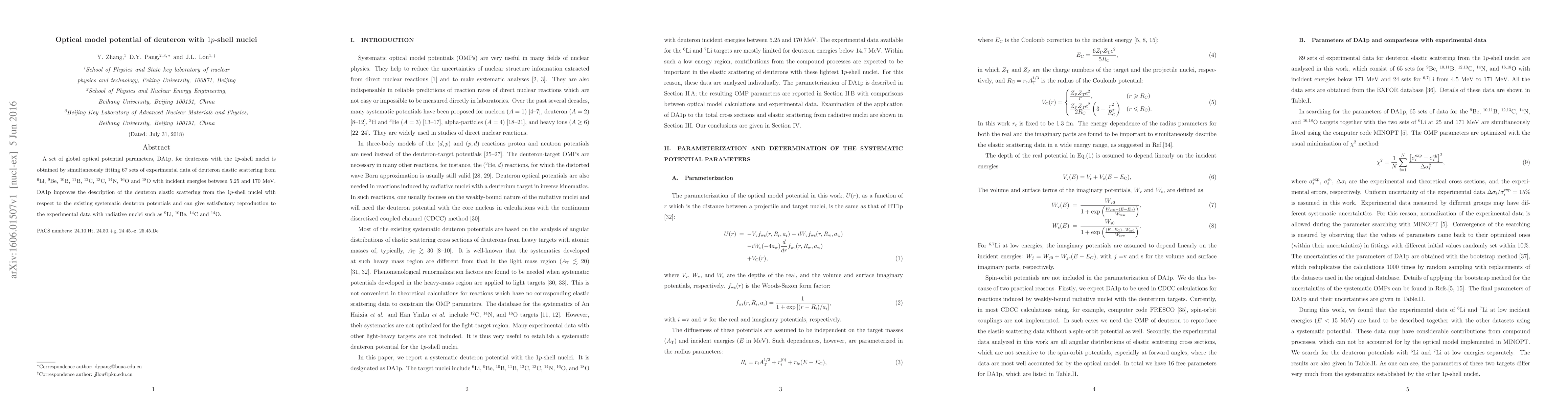 A set of global optical potential parameters, DA1p, for deuterons with the $1p$-shell nuclei is obtained by simultaneously fitting 67 sets of experimental data of deuteron elastic scattering from \nuc{6}{Li}, \nuc{9}{Be}, \nuc{10}{B}, \nuc{11}{B}, \nuc{12}{C}, \nuc{13}{C}, \nuc{14}{N}, \nuc{16}{O} and \nuc{18}{O} with incident energies between 5.25 and 170 MeV. DA1p improves the description of the deuteron elastic scattering from the $1p$-shell nuclei with respect to the existing systematic deuteron potentials and can give satisfactory reproduction to the experimental data with radiative nuclei such as \nuc{9}{Li}, \nuc{10}{Be}, \nuc{14}{C} and \nuc{14}{O}.
