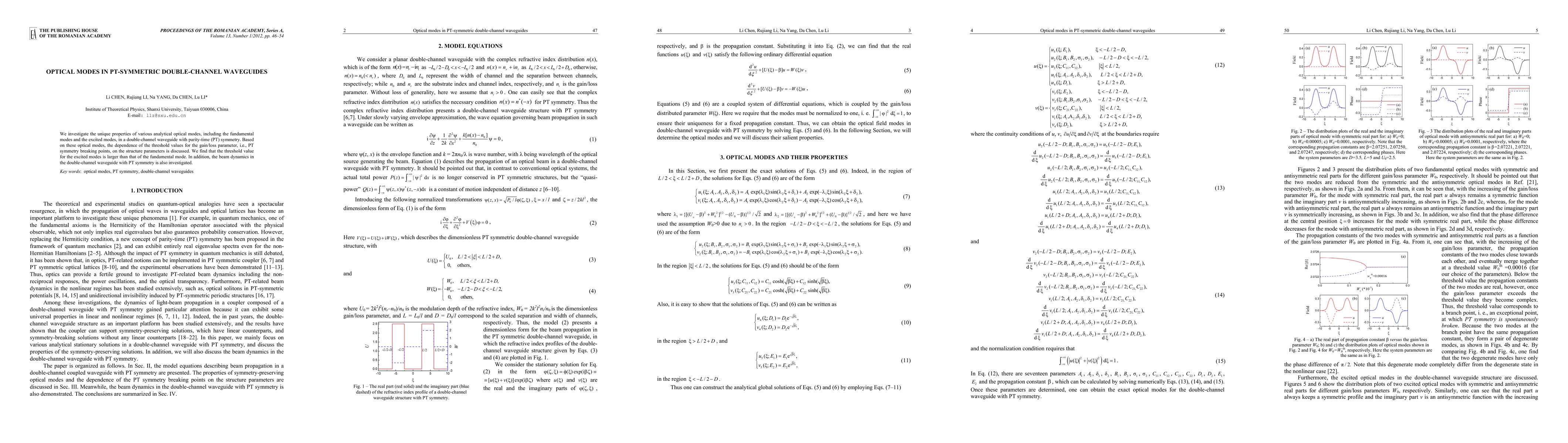 This paper explores the optical modes in PT-symmetric double-channel waveguides, revealing that excited modes require higher gain/loss thresholds than fundamental modes for PT symmetry breaking. It also examines the beam dynamics in these waveguides.