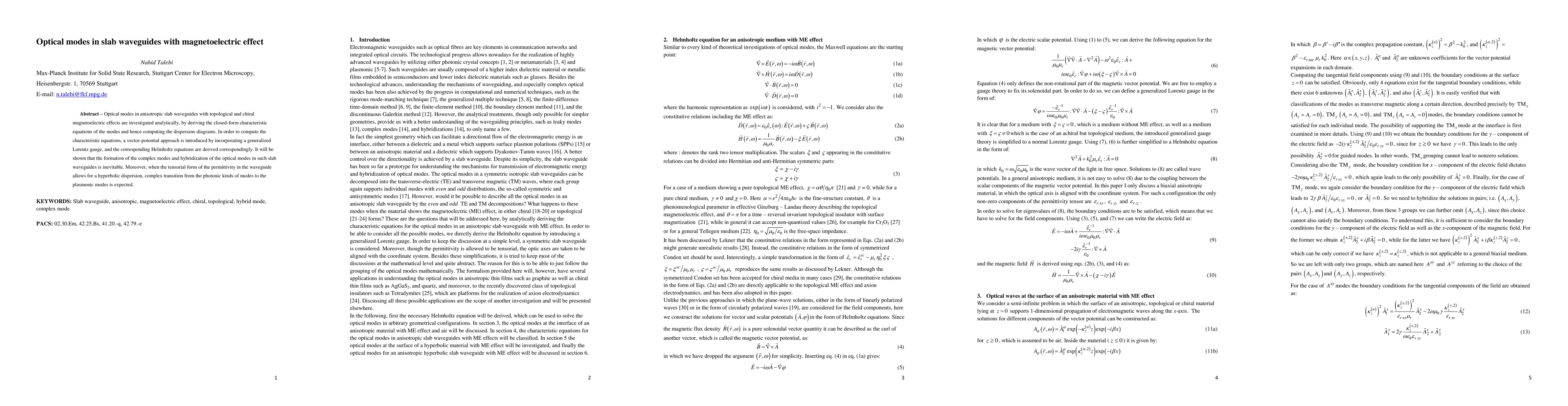 Optical modes in anisotropic slab waveguides with topological and chiral magnetoelectric effects are investigated analytically, by deriving the closed-form characteristic equations of the modes and hence computing the dispersion-diagrams. In order to compute the characteristic equations, a vector-potential approach is introduced by incorporating a generalized Lorentz gauge, and the corresponding Helmholtz equations are derived correspondingly. It will be shown that the formation of the complex modes and hybridization of the optical modes in such slab waveguides is inevitable. Moreover, when the tensorial form of the permittivity in the waveguide allows for a hyperbolic dispersion, complex transition from the photonic kinds of modes to the plasmonic modes is expected.