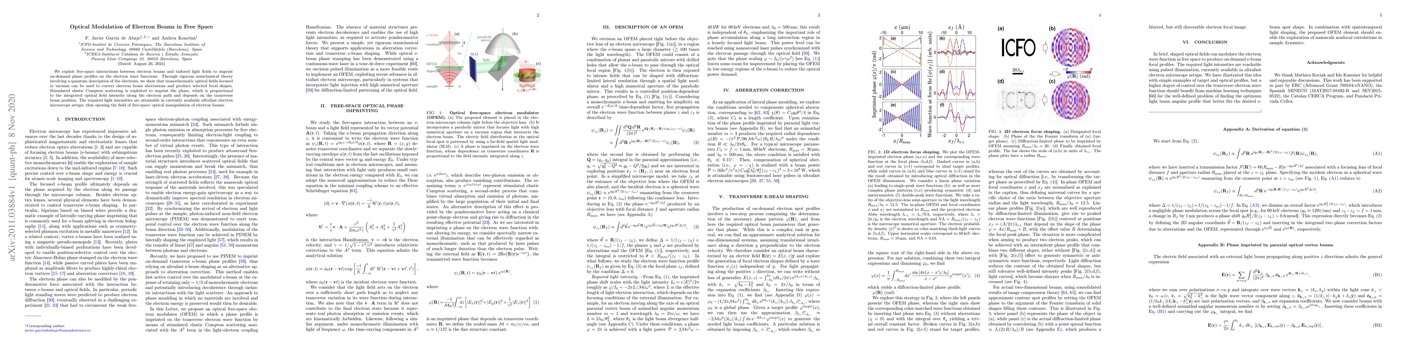 This paper demonstrates the use of tailored light fields to imprint phase profiles on electron beams in free space, correcting aberrations and shaping focal profiles via stimulated elastic Compton scattering. This technique is feasible using current ultrafast electron microscope technology, paving the way for advanced free-space manipulation of electron beams.