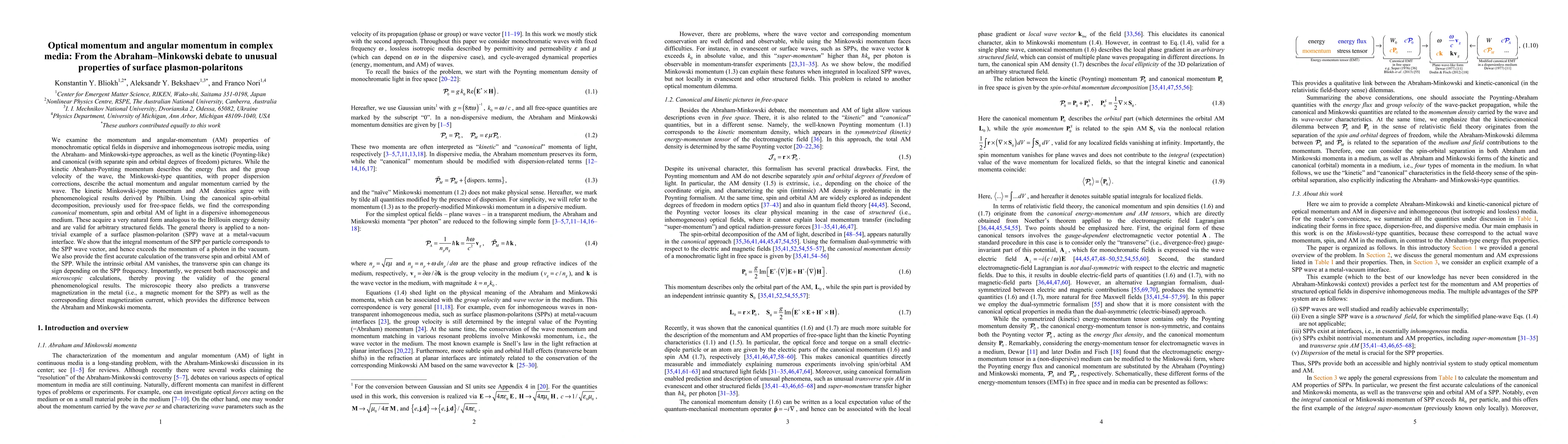 We examine the momentum and angular-momentum (AM) properties of monochromatic optical fields in dispersive and inhomogeneous isotropic media, using the Abraham- and Minkowski-type approaches, as well as the kinetic (Poynting-like) and canonical (with separate spin and orbital degrees of freedom) pictures. While the kinetic Abraham-Poynting momentum describes the energy flux and the group velocity of the wave, the Minkowski-type quantities, with proper dispersion corrections, describe the actual momentum and angular momentum carried by the wave. The kinetic Minkowski-type momentum and AM densities agree with phenomenological results derived by Philbin. Using the canonical spin-orbital decomposition, previously used for free-space fields, we find the corresponding canonical momentum, spin and orbital AM of light in a dispersive inhomogeneous medium. These acquire a very natural form analogous to the Brillouin energy density and are valid for arbitrary structured fields. The general theory is applied to a non-trivial example of a surface plasmon-polariton (SPP) wave at a metal-vacuum interface. We show that the integral momentum of the SPP per particle corresponds to the SPP wave vector, and hence exceeds the momentum of a photon in the vacuum. We also provide the first accurate calculation of the transverse spin and orbital AM of the SPP. While the intrinsic orbital AM vanishes, the transverse spin can change its sign depending on the SPP frequency. Importantly, we present both macroscopic and microscopic calculations, thereby proving the validity of the general phenomenological results. The microscopic theory also predicts a transverse magnetization in the metal (i.e., a magnetic moment for the SPP) as well as the corresponding direct magnetization current, which explains the difference between the Abraham and Minkowski momenta.