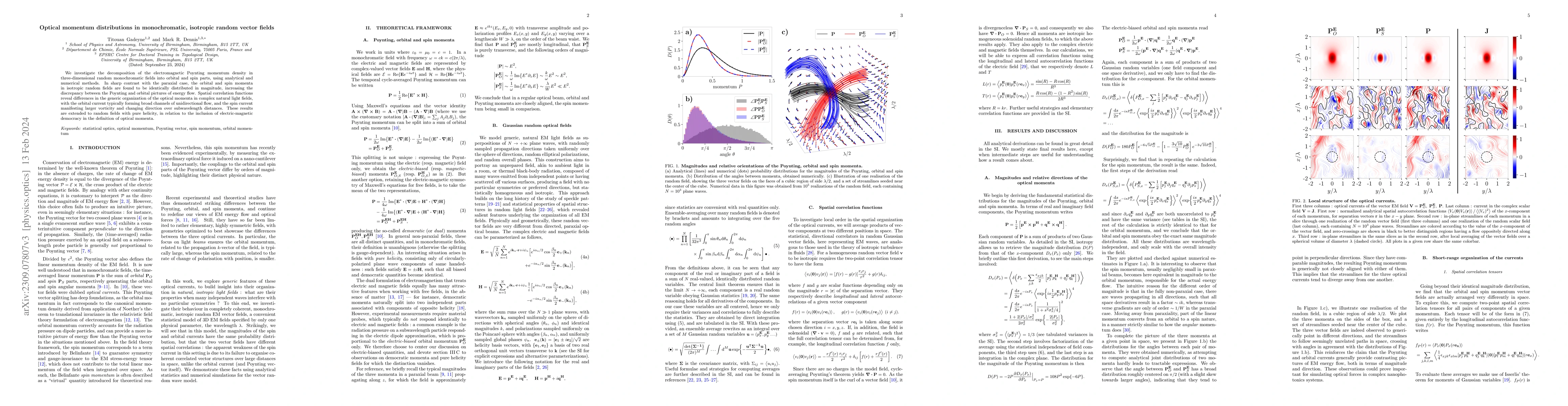 This paper decomposes the electromagnetic Poynting momentum in isotropic random monochromatic fields into orbital and spin components, revealing equal distribution in magnitude and contrasting spatial organization. The study highlights differences in energy flow and optical momentum organization in natural light fields.