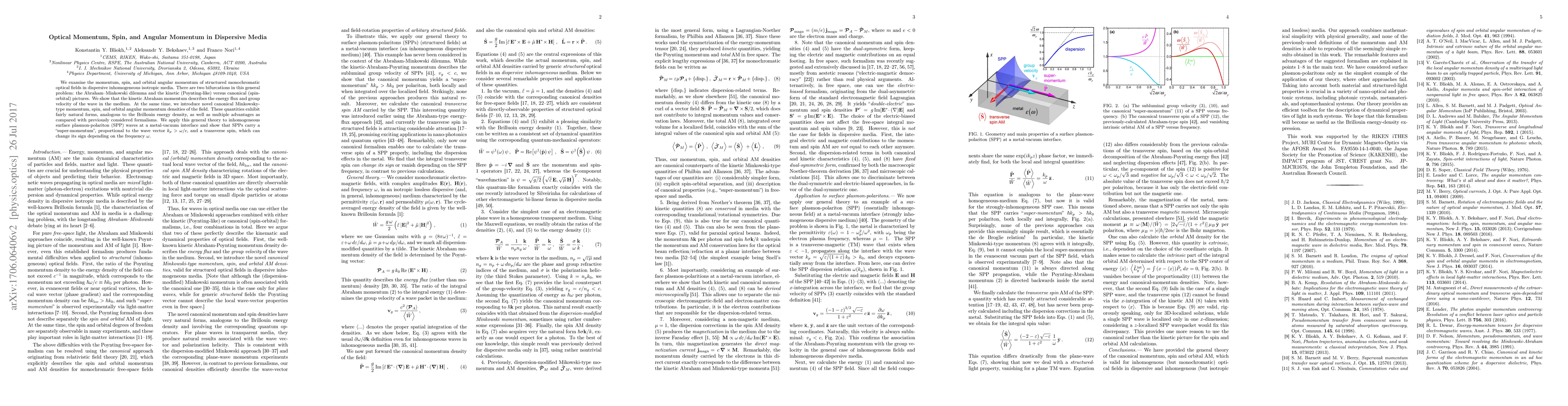 This paper investigates the momentum, spin, and angular momentum of structured optical fields in dispersive media, resolving the Abraham-Minkowski dilemma. It introduces novel canonical momentum and angular momentum densities, demonstrating advantages over previous formalisms and applying the theory to surface plasmon-polariton waves.