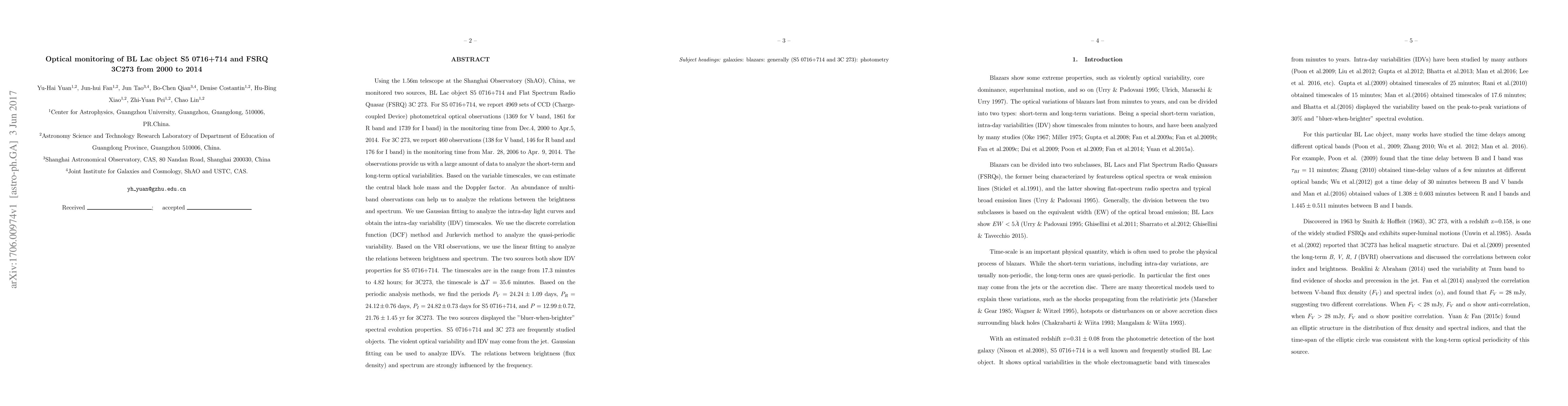 Using the 1.56m telescope at the Shanghai Observatory (ShAO), China, we monitored two sources, BL Lac object S5 0716+714 and Flat Spectrum Radio Quasar (FSRQ) 3C 273. For S5 0716+714, we report 4969 sets of CCD (Charge-coupled Device) photometrical optical observations (1369 for V band, 1861 for R band and 1739 for I band) in the monitoring time from Dec.4, 2000 to Apr.5, 2014. For 3C 273, we report 460 observations (138 for V band, 146 for R band and 176 for I band) in the monitoring time from Mar. 28, 2006 to Apr. 9, 2014. The observations provide us with a large amount of data to analyze the short-term and long-term optical variabilities. Based on the variable timescales, we can estimate the central black hole mass and the Doppler factor. An abundance of multi-band observations can help us to analyze the relations between the brightness and spectrum. We use Gaussian fitting to analyze the intra-day light curves and obtain the intra-day variability (IDV) timescales. We use the discrete correlation function (DCF) method and Jurkevich method to analyze the quasi-periodic variability. Based on the VRI observations, we use the linear fitting to analyze the relations between brightness and spectrum. The two sources both show IDV properties for S5 0716+714. The timescales are in the range from 17.3 minutes to 4.82 hours; for 3C273, the timescale is 35.6 minutes. Based on the periodic analysis methods, we find the periods P(V) = 24.24 days, P(R)=24.12 days, P(I)=24.82 days for S5 0716+714, and P = 12.99, 21.76 yr for 3C273. The two sources displayed the "bluer-when-brighter" spectral evolution properties. S5 0716+714 and 3C 273 are frequently studied objects. The violent optical variability and IDV may come from the jet. Gaussian fitting can be used to analyze IDVs. The relations between brightness (flux density) and spectrum are strongly influenced by the frequency.