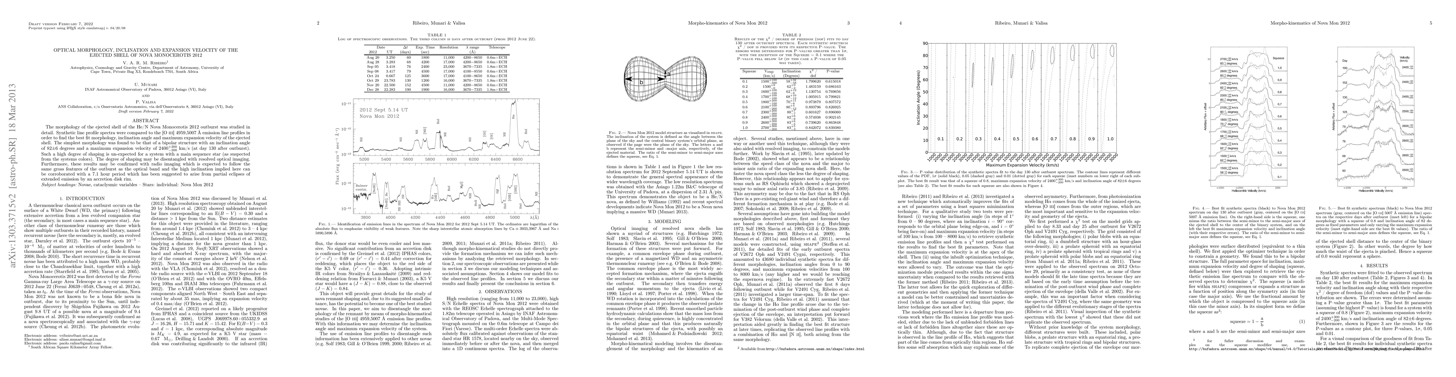 The morphology of the ejected shell of the He/N Nova Monocerotis 2012 outburst was studied in detail. Synthetic line profile spectra were compared to the [O {\sc iii}] 4959,5007 \AA\ emission line profiles in order to find the best fit morphology, inclination angle and maximum expansion velocity of the ejected shell. The simplest morphology was found to be that of a bipolar structure with an inclination angle of 82$\pm6$ degrees and a maximum expansion velocity of 2400$^{+300}_{-200}$ km/s (at day 130 after outburst). Such a high degree of shaping is un-expected for a system with a main sequence star (as suspected from the systems colors). The degree of shaping may be disentangled with resolved optical imaging. Furthermore, these results may be confirmed with radio imaging which is expected to follow the same gross features of the outburst as the optical band and the high inclination implied here can be corroborated with a 7.1 hour period which has been suggested to arise from partial eclipses of extended emission by an accretion disk rim.