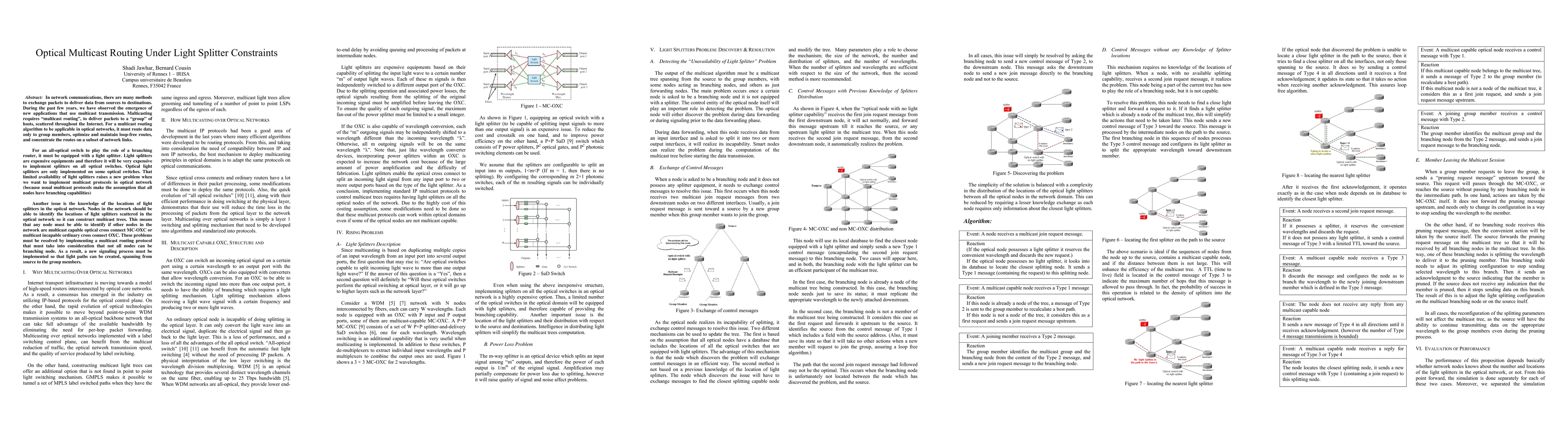 This paper discusses challenges in implementing multicast routing in optical networks due to the limited availability of expensive light splitters. It proposes a new signaling process to create light paths from source to group members, considering not all nodes can act as branching nodes, and the need for nodes to identify light splitter locations.