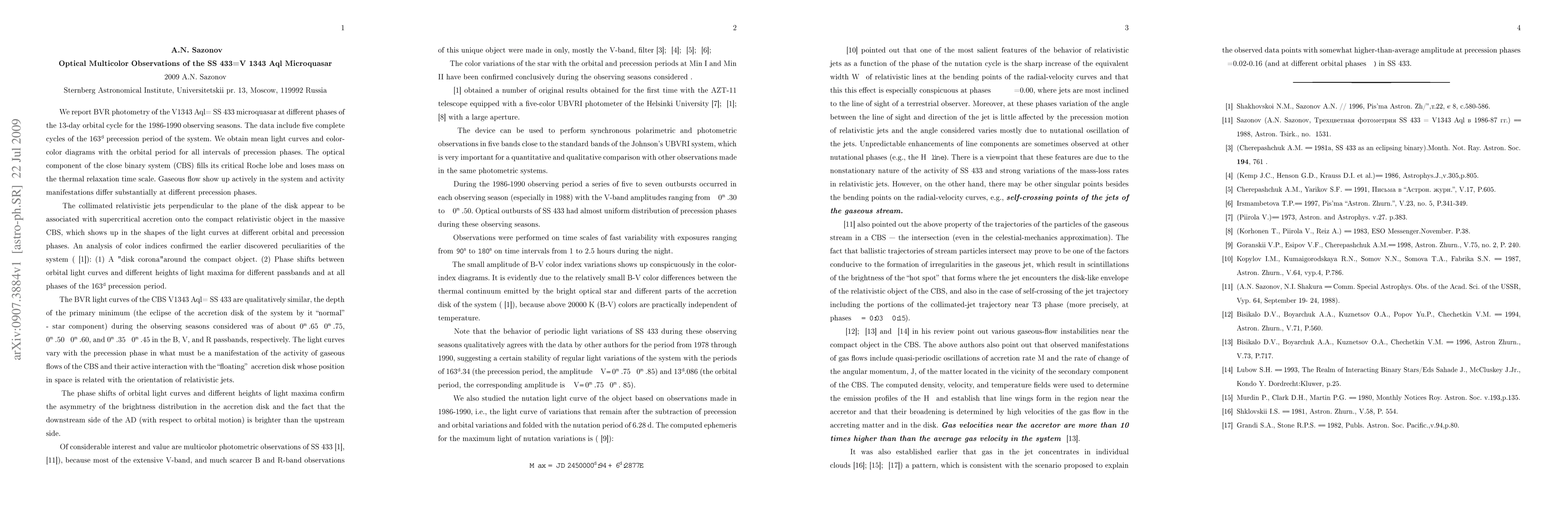 We report BVR photometry of the V1343 Aql= SS 433 microquasar at different phases of the 13-day orbital cycle for the 1986-1990 observing seasons. The data include five complete cycles of the 163$^{d}$ precession period of the system. We obtain mean light curves and color-color diagrams with the orbital period for all intervals of precession phases. The optical component of the close binary system (CBS) fills its critical Roche lobe and loses mass on the thermal relaxation time scale. Gaseous flow show up actively in the system and activity manifestations differ substantially at different precession phases.