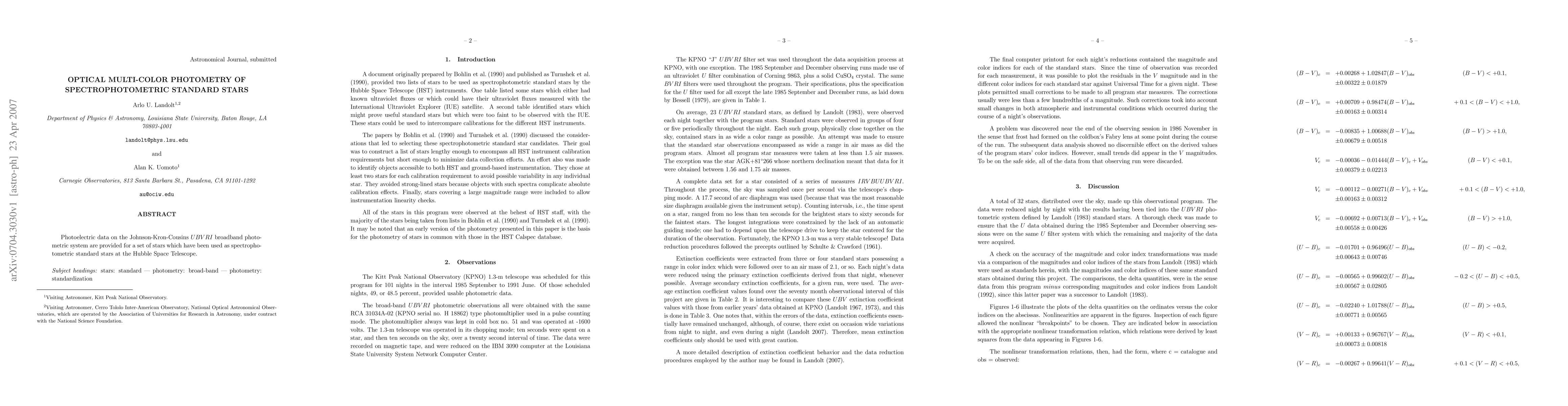 Summary: This paper presents photoelectric data for a set of spectrophotometric standard stars used in the Johnson-Kron-Cousins UBVRI broadband photometric system, specifically for calibration at the Hubble Space Telescope. The data serves as a reference for optical multicolor photometry.