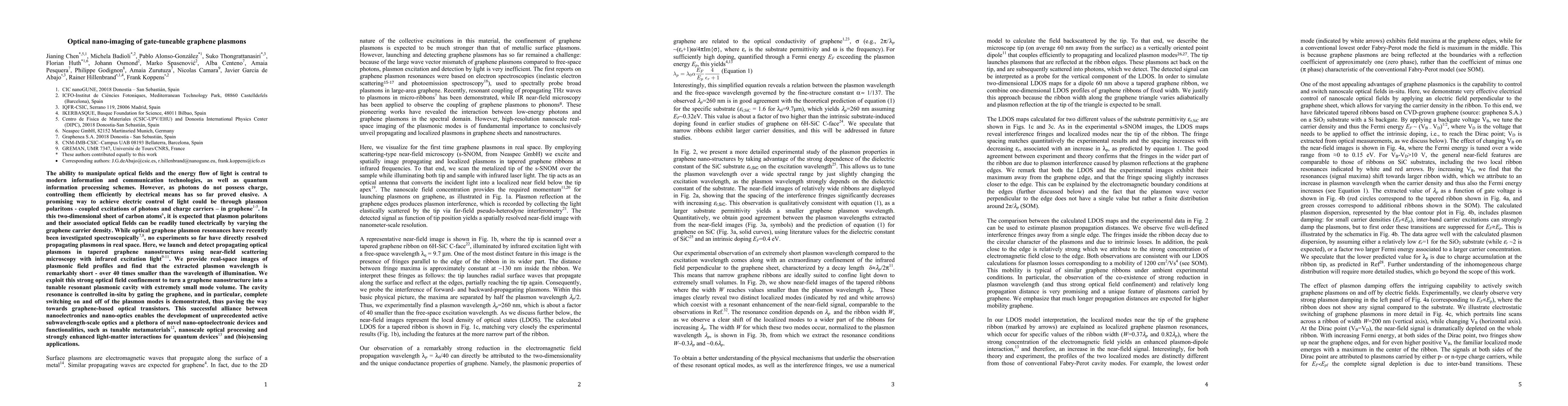 This paper demonstrates the optical nano-imaging of gate-tuned graphene plasmons, showing the ability to control plasmon modes electrically by gating graphene. The study reveals short plasmon wavelengths and enables the creation of tunable plasmonic cavities, paving the way for graphene-based optical transistors and advanced nano-optoelectronic devices.