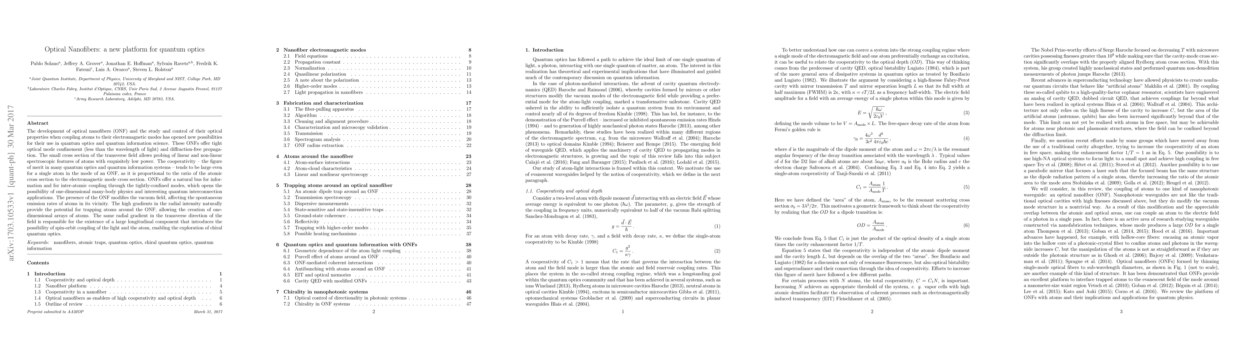 The development of optical nanofibers (ONF) and the study and control of their optical properties when coupling atoms to their electromagnetic modes has opened new possibilities for their use in quantum optics and quantum information science. These ONFs offer tight optical mode confinement (less than the wavelength of light) and diffraction-free propagation. The small cross section of the transverse field allows probing of linear and non-linear spectroscopic features of atoms with exquisitely low power. The cooperativity -- the figure of merit in many quantum optics and quantum information systems -- tends to be large even for a single atom in the mode of an ONF, as it is proportional to the ratio of the atomic cross section to the electromagnetic mode cross section. ONFs offer a natural bus for information and for inter-atomic coupling through the tightly-confined modes, which opens the possibility of one-dimensional many-body physics and interesting quantum interconnection applications. The presence of the ONF modifies the vacuum field, affecting the spontaneous emission rates of atoms in its vicinity. The high gradients in the radial intensity naturally provide the potential for trapping atoms around the ONF, allowing the creation of one-dimensional arrays of atoms. The same radial gradient in the transverse direction of the field is responsible for the existence of a large longitudinal component that introduces the possibility of spin-orbit coupling of the light and the atom, enabling the exploration of chiral quantum optics.