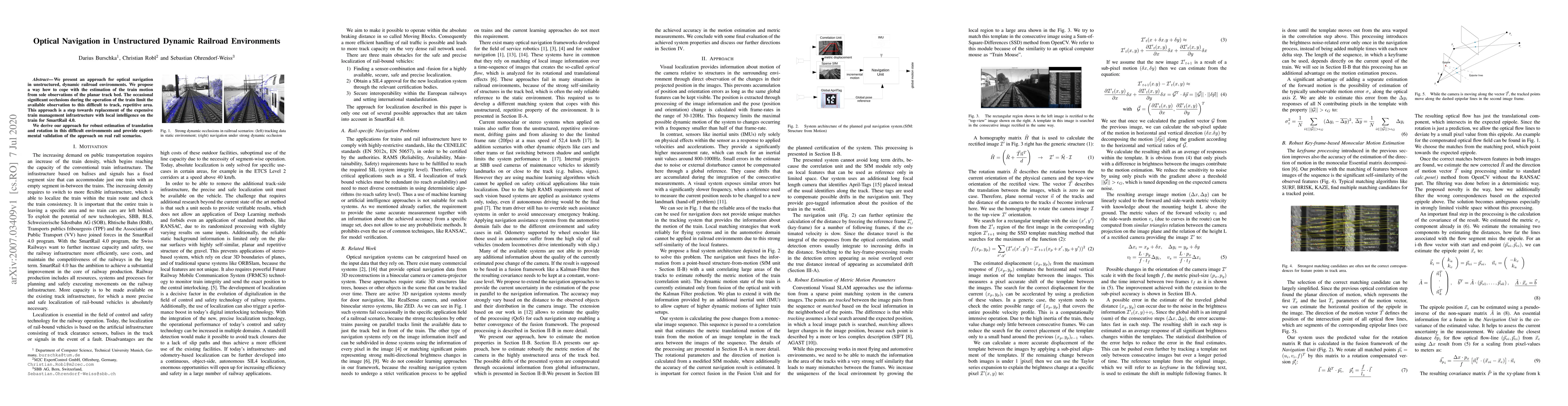 We present an approach for optical navigation in unstructured, dynamic railroad environments. We propose a way how to cope with the estimation of the train motion from sole observations of the planar track bed. The occasional significant occlusions during the operation of the train limit the available observation to this difficult to track, repetitive area. This approach is a step towards replacement of the expensive train management infrastructure with local intelligence on the train for SmartRail 4.0. We derive our approach for robust estimation of translation and rotation in this difficult environments and provide experimental validation of the approach on real rail scenarios.
