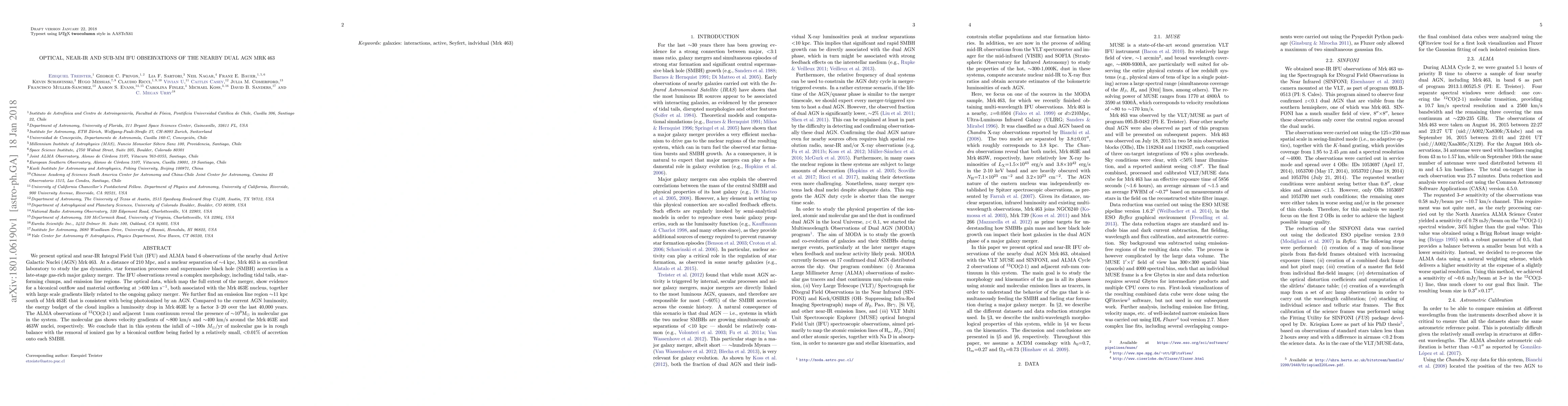 We present optical and near-IR Integral Field Unit (IFU) and ALMA band 6 observations of the nearby dual Active Galactic Nuclei (AGN) Mrk 463. At a distance of 210 Mpc, and a nuclear separation of $\sim$4 kpc, Mrk 463 is an excellent laboratory to study the gas dynamics, star formation processes and supermassive black hole (SMBH) accretion in a late-stage gas-rich major galaxy merger. The IFU observations reveal a complex morphology, including tidal tails, star-forming clumps, and emission line regions. The optical data, which map the full extent of the merger, show evidence for a biconical outflow and material outflowing at $>$600 km s$^{-1}$, both associated with the Mrk 463E nucleus, together with large scale gradients likely related to the ongoing galaxy merger. We further find an emission line region $\sim$11 kpc south of Mrk 463E that is consistent with being photoionized by an AGN. Compared to the current AGN luminosity, the energy budget of the cloud implies a luminosity drop in Mrk 463E by a factor 3-20 over the last 40,000 years. The ALMA observations of $^{12}$CO(2-1) and adjacent 1mm continuum reveal the presence of $\sim$10$^{9}$M$_\odot$ in molecular gas in the system. The molecular gas shows velocity gradients of $\sim$800 km/s and $\sim$400 km/s around the Mrk 463E and 463W nuclei, respectively. We conclude that in this system the infall of $\sim$100s $M_\odot$/yr of molecular gas is in rough balance with the removal of ionized gas by a biconical outflow being fueled by a relatively small, $<$0.01% of accretion onto each SMBH.