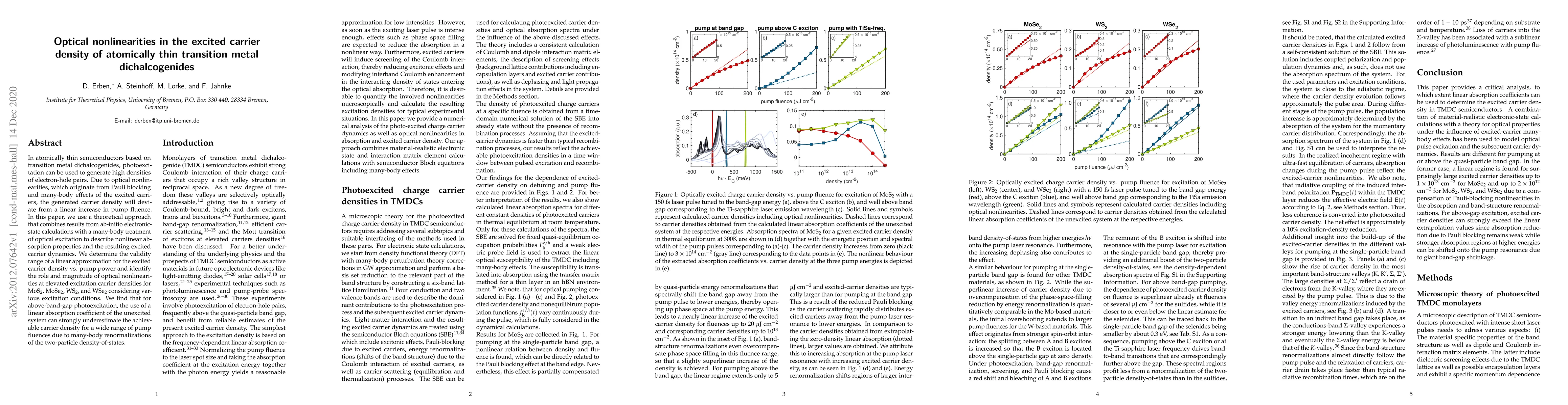 In atomically thin semiconductors based on transition metal dichalcogenides, photoexcitation can be used to generate high densities of electron-hole pairs. Due to optical nonlinearities, which originate from Pauli blocking and many-body effects of the excited carriers, the generated carrier density will deviate from a linear increase in pump fluence. In this paper, we use a theoretical approach that combines results from ab-initio electronic-state calculations with a many-body treatment of optical excitation to describe nonlinear absorption properties and the resulting excited carrier dynamics. We determine the validity range of a linear approximation for the excited carrier density vs. pump power and identify the role and magnitude of optical nonlinearities at elevated excitation carrier densities for MoS2, MoSe2, WS2, and WSe2 considering various excitation conditions. We find that for above-band-gap photoexcitation, the use of a linear absorption coefficient of the unexcited system can strongly underestimate the achievable carrier density for a wide range of pump fluences due to many-body renormalizations of the two-particle density-of-states.