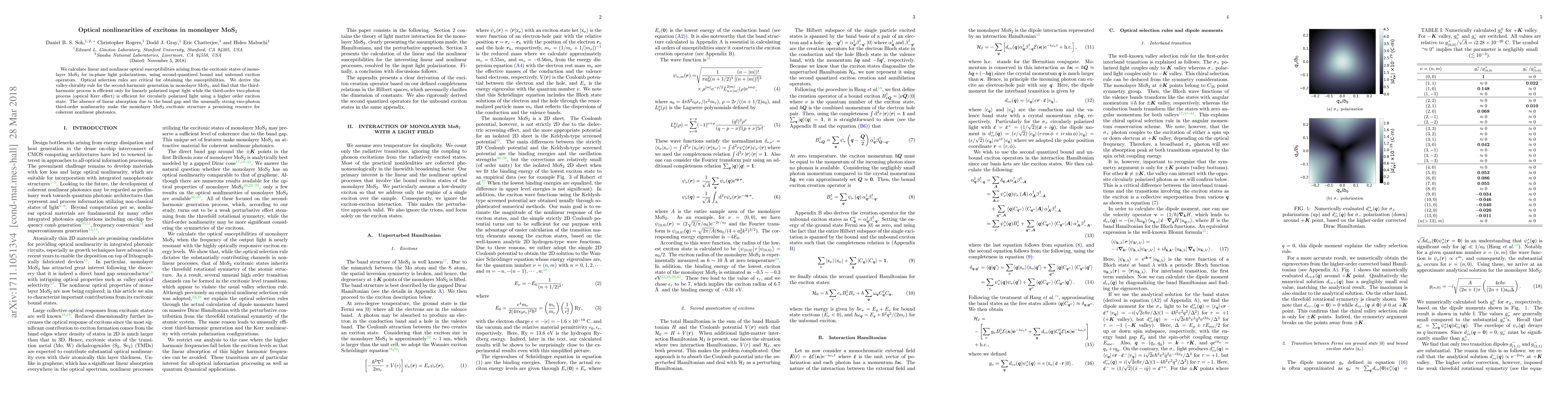 This study investigates the optical nonlinearities in monolayer MoS2 arising from excitonic states, revealing that second harmonic generation follows a valley-chirality rule and third-harmonic generation is efficient for linearly polarized light. The material's strong third-order nonlinearity makes it a promising candidate for coherent nonlinear photonics applications.