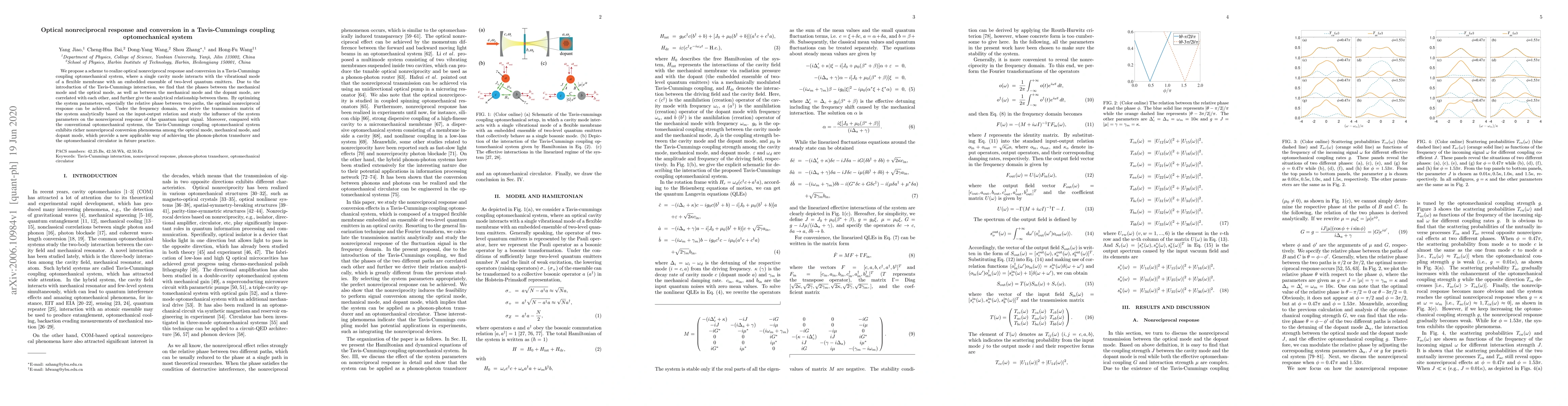 This paper proposes a scheme for optical nonreciprocal response and conversion in a Tavis-Cummings coupling optomechanical system, demonstrating richer nonreciprocal phenomena compared to conventional systems, which could potentially enable phonon-photon transducers and optomechanical circulators. Analytical relationships and transmission matrices are derived to optimize the system for enhanced nonreciprocal response.