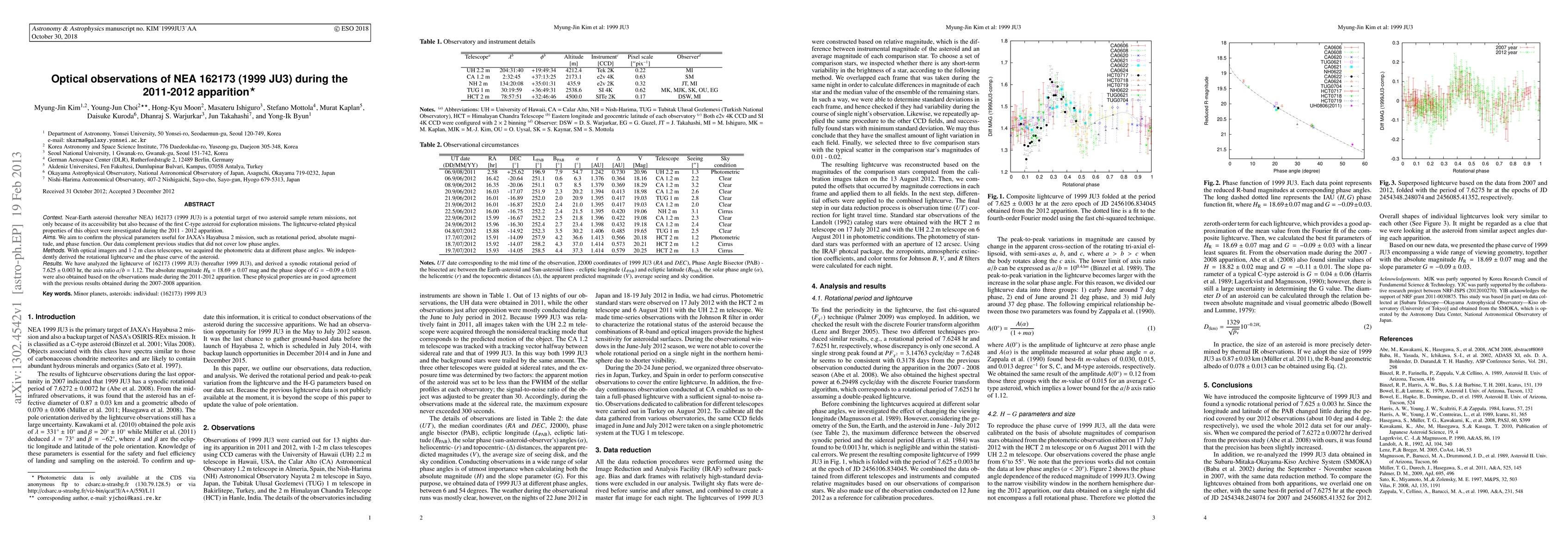 Researchers observed Near-Earth asteroid 162173 (1999 JU3) during its 2011-2012 apparition, confirming its physical parameters for the Hayabusa 2 mission, including a rotational period of 7.625 hours and an absolute magnitude of 18.69.