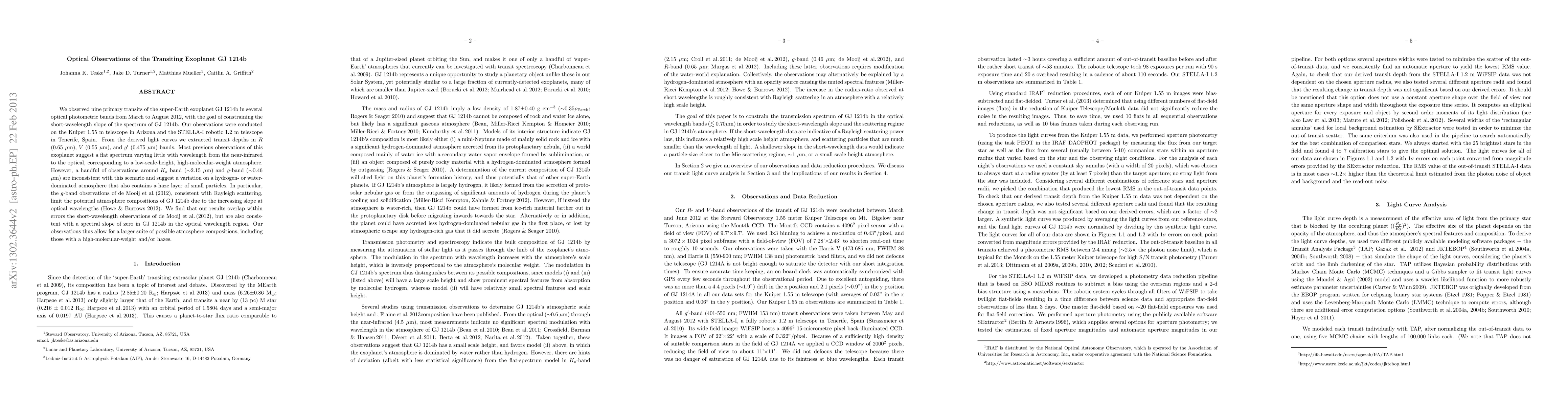 This study observed nine transits of the exoplanet GJ 1214b in optical bands to determine its atmospheric composition, finding that while previous observations suggest a flat spectrum, new data allow for a broader range of atmospheric compositions, including high-molecular-weight atmospheres and hazes.