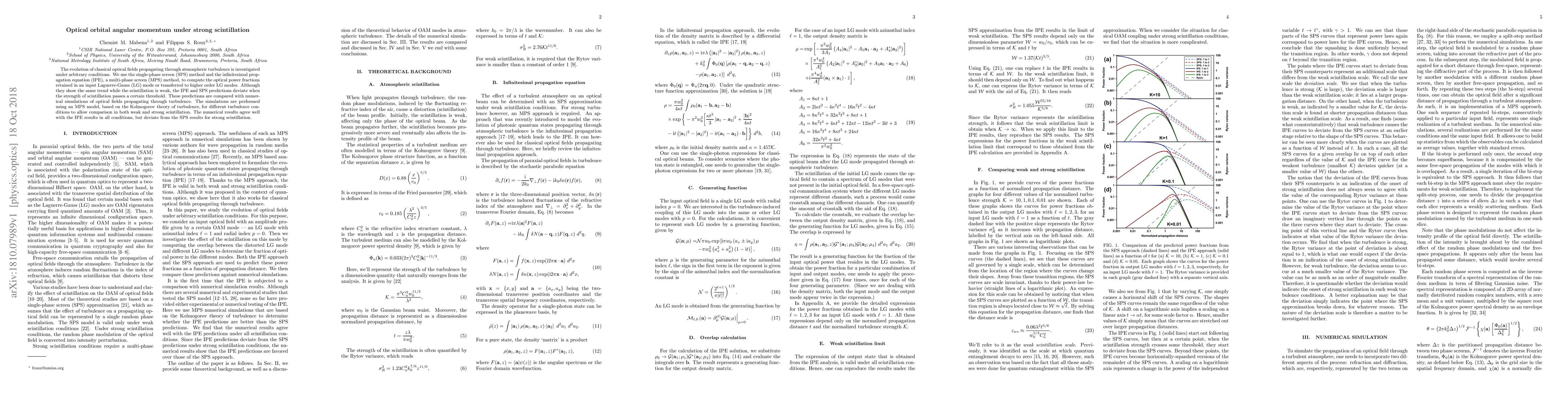 The evolution of classical optical fields propagating through atmospheric turbulence is investigated under arbitrary conditions. We use the single-phase screen (SPS) method and the infinitesimal propagation equation (IPE), a multi-phase screen (MPS) method, to compute the optical power fractions retained in an input Laguerre-Gauss (LG) mode or transferred to higher order LG modes. Although they show the same trend while the scintillation is weak, the IPE and SPS predictions deviate when the strength of scintillation passes a certain threshold. These predictions are compared with numerical simulations of optical fields propagating through turbulence. The simulations are performed using an MPS model, based on the Kolmogorov theory of turbulence, for different turbulence conditions to allow comparison in both weak and strong scintillation. The numerical results agree well with the IPE results in all conditions, but deviate from the SPS results for strong scintillation.