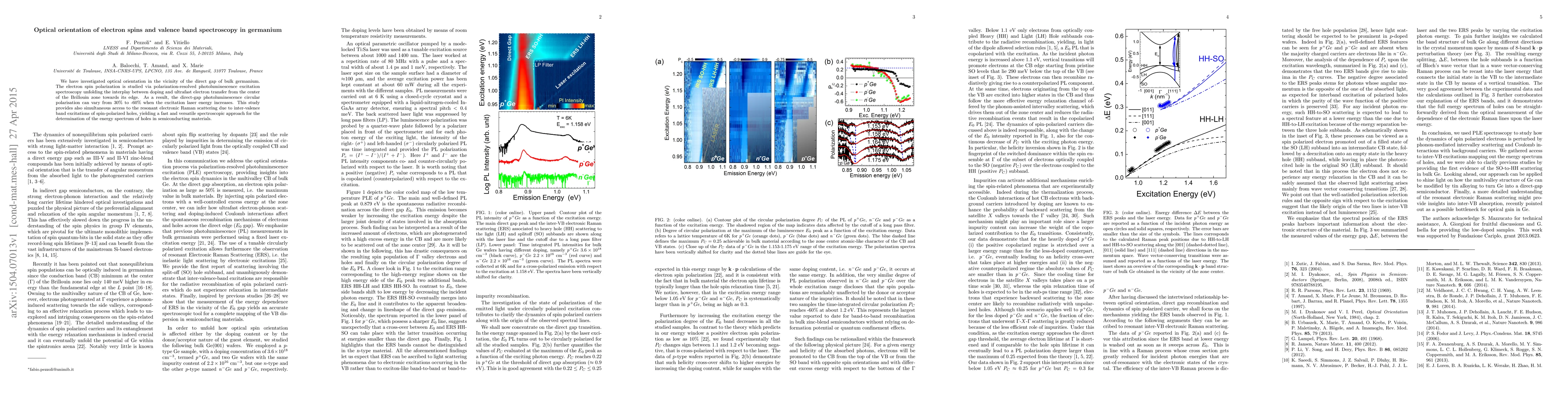 We have investigated optical orientation in the vicinity of the direct gap of bulk germanium. The electron spin polarization is studied via polarization-resolved photoluminescence excitation spectroscopy unfolding the interplay between doping and ultrafast electron transfer from the center of the Brillouin zone towards its edge. As a result, the direct-gap photoluminescence circular polarisation can vary from 30% to -60% when the excitation laser energy increases. This study provides also simultaneous access to the resonant electronic Raman scattering due to inter-valence band excitations of spin-polarized holes, yielding a fast and versatile spectroscopic approach for the determination of the energy spectrum of holes in semiconducting materials.