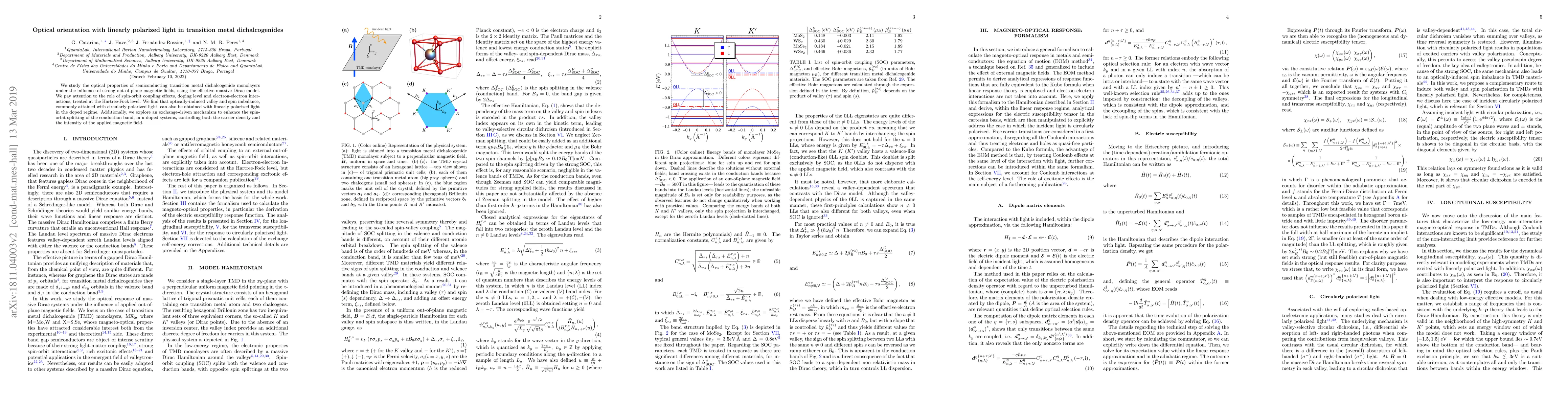 We study the optical properties of semiconducting transition metal dichalcogenide monolayers under the influence of strong out-of-plane magnetic fields, using the effective massive Dirac model. We pay attention to the role of spin-orbit coupling effects, doping level and electron-electron interactions, treated at the Hartree-Fock level. We find that optically-induced valley and spin imbalance, commonly attained with circularly polarized light, can also be obtained with linearly polarized light in the doped regime. Additionally, we explore an exchange-driven mechanism to enhance the spin-orbit splitting of the conduction band, in n-doped systems, controlling both the carrier density and the intensity of the applied magnetic field.