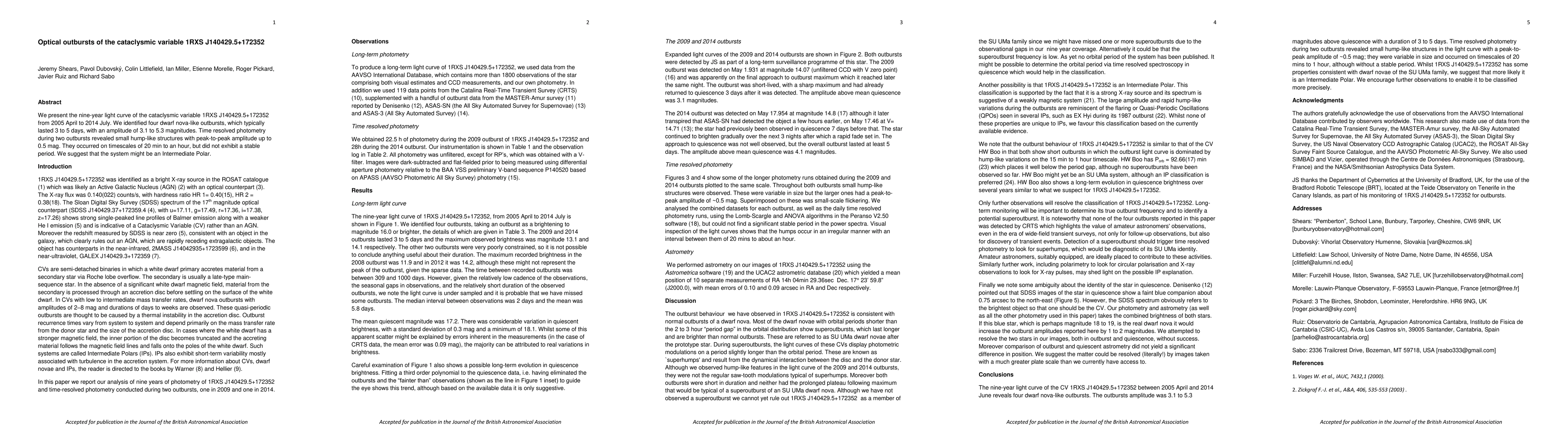 This study presents a nine-year light curve of the cataclysmic variable 1RXS J140429.5+172352, identifying four dwarf nova-like outbursts with small, unstable hump-like structures during two of them, suggesting the system may be an Intermediate Polar.