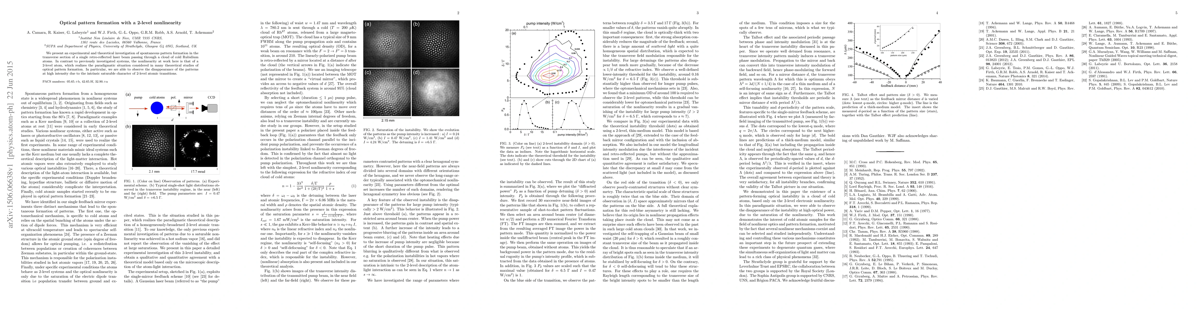 We present an experimental and theoretical investigation of spontaneous pattern formation in the transverse section of a single retro-reflected laser beam passing through a cloud of cold Rubidium atoms. In contrast to previously investigated systems, the nonlinearity at work here is that of a 2-level atom, which realizes the paradigmatic situation considered in many theoretical studies of optical pattern formation. In particular, we are able to observe the disappearance of the patterns at high intensity due to the intrinsic saturable character of 2-level atomic transitions.