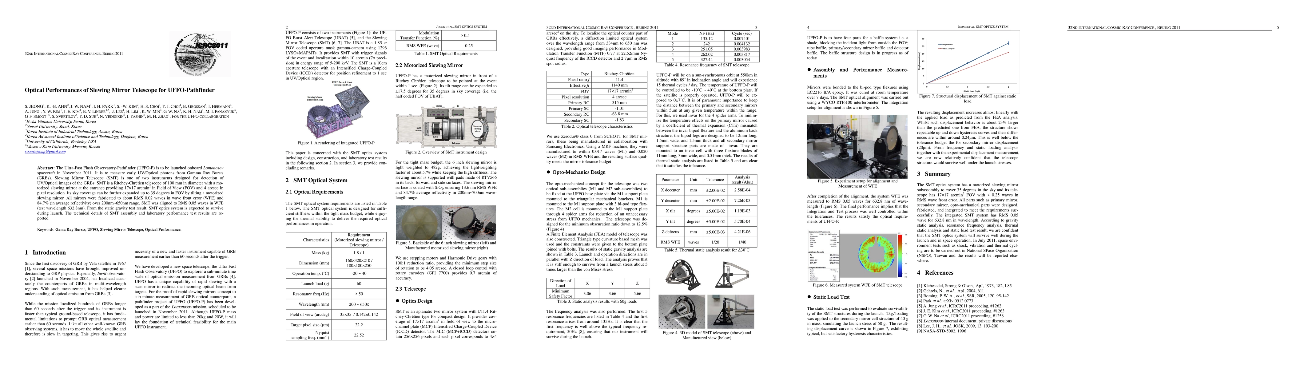 The Ultra-Fast Flash Observatory-Pathfinder (UFFO-P) is to be launched onboard Lomonosov spacecraft in November 2011. It is to measure early UV/Optical photons from Gamma Ray Bursts (GRBs). Slewing Mirror Telescope (SMT) is one of two instruments designed for detection of UV/Optical images of the GRBs. SMT is a Ritchey-Chr\'etien telescope of 100 mm in diameter with a motorized slewing mirror at the entrance providing 17\times17 arcmin2 in Field of View (FOV) and 4 arcsec in pixel resolution. Its sky coverage can be further expanded up to 35 degrees in FOV by tilting a motorized slewing mirror. All mirrors were fabricated to about RMS 0.02 waves in wave front error (WFE) and 84.7% (in average reflectivity) over 200nm~650nm range. SMT was aligned to RMS 0.05 waves in WFE (test wavelength 632.8nm). From the static gravity test result, SMT optics system is expected to survive during launch. The technical details of SMT assembly and laboratory performance test results are reported.