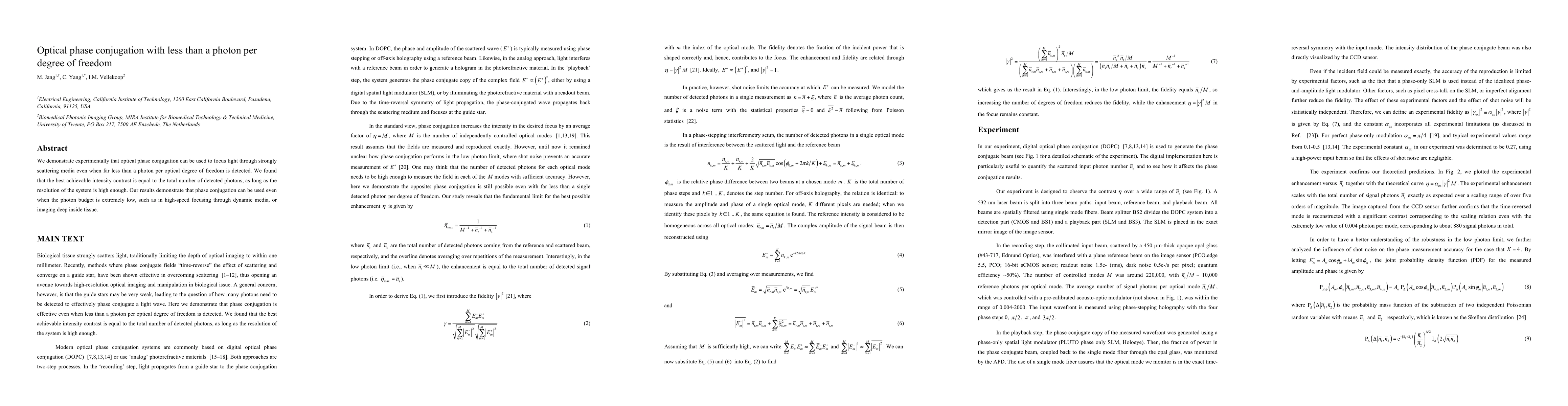 We demonstrate experimentally that optical phase conjugation can be used to focus light through strongly scattering media even when far less than a photon per optical degree of freedom is detected. We found that the best achievable intensity contrast is equal to the total number of detected photons, as long as the resolution of the system is high enough. Our results demonstrate that phase conjugation can be used even when the photon budget is extremely low, such as in high-speed focusing through dynamic media, or imaging deep inside tissue.