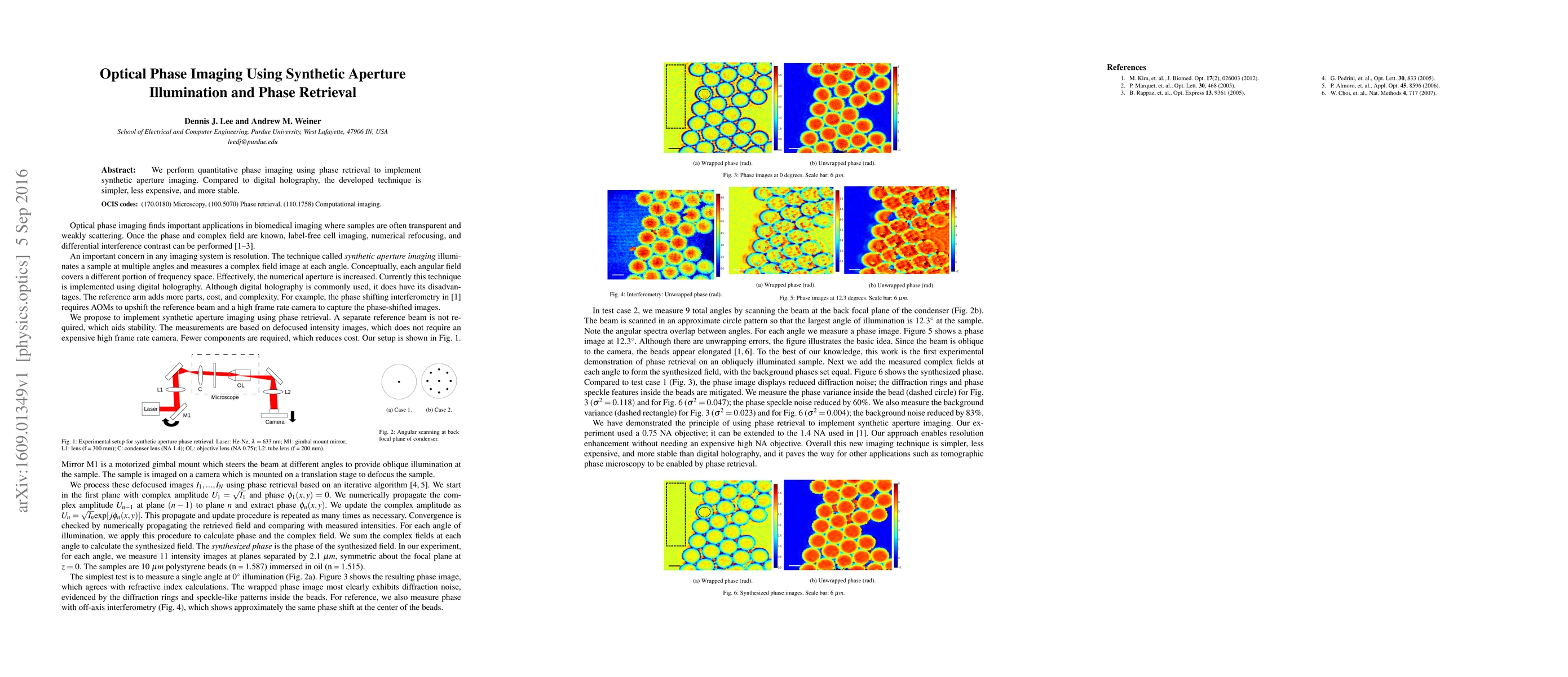 Summary: This paper introduces a synthetic aperture illumination technique for quantitative phase imaging using phase retrieval, offering a simpler, cost-effective, and more stable alternative to digital holography. The method enhances imaging stability and reduces complexity.