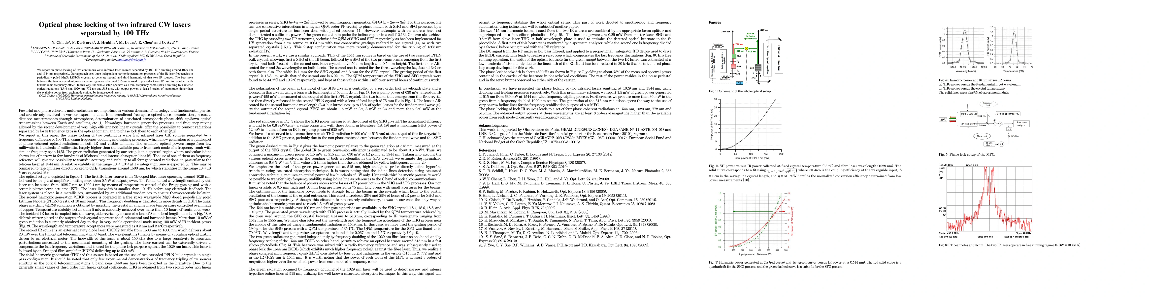 We report on phase-locking of two continuous wave infrared laser sources separated by 100 THz emitting around 1029 nm and 1544 nm respectively. Our approach uses three independent harmonic generation processes of the IR laser frequencies in periodically poled MgO: LiNbO3 crystals to generate second and third harmonic of that two IR sources. The beat note between the two independent green radiations generated around 515 nm is used to phase-lock one IR laser to the other, with tunable radio frequency offset. In this way, the whole setup operates as a mini frequency comb (MFC) emitting four intense optical radiations (1544 nm, 1029 nm, 772 nm and 515 nm), with output powers at least 3 orders of magnitude higher than the available power from each mode emitted by femtosecond lasers.