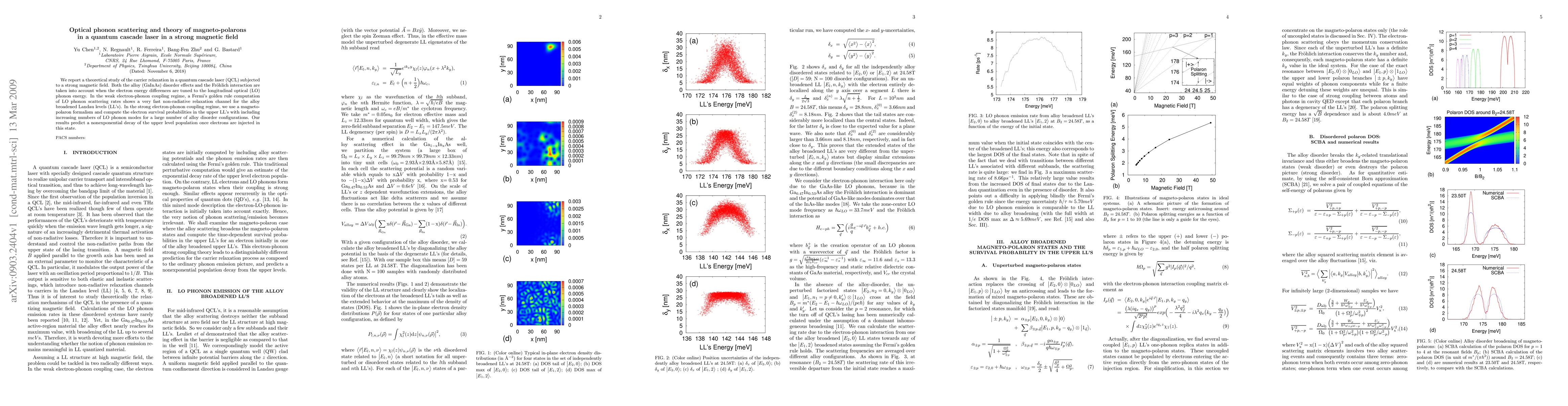We report a theoretical study of the carrier relaxation in a quantum cascade laser (QCL) subjected to a strong magnetic field. Both the alloy (GaInAs) disorder effects and the Frohlich interaction are taken into account when the electron energy differences are tuned to the longitudinal optical (LO) phonon energy. In the weak electron-phonon coupling regime, a Fermi's golden rule computation of LO phonon scattering rates shows a very fast non-radiative relaxation channel for the alloy broadened Landau levels (LL's). In the strong electron-phonon coupling regime, we use a magneto-polaron formalism and compute the electron survival probabilities in the upper LL's with including increasing numbers of LO phonon modes for a large number of alloy disorder configurations. Our results predict a nonexponential decay of the upper level population once electrons are injected in this state.