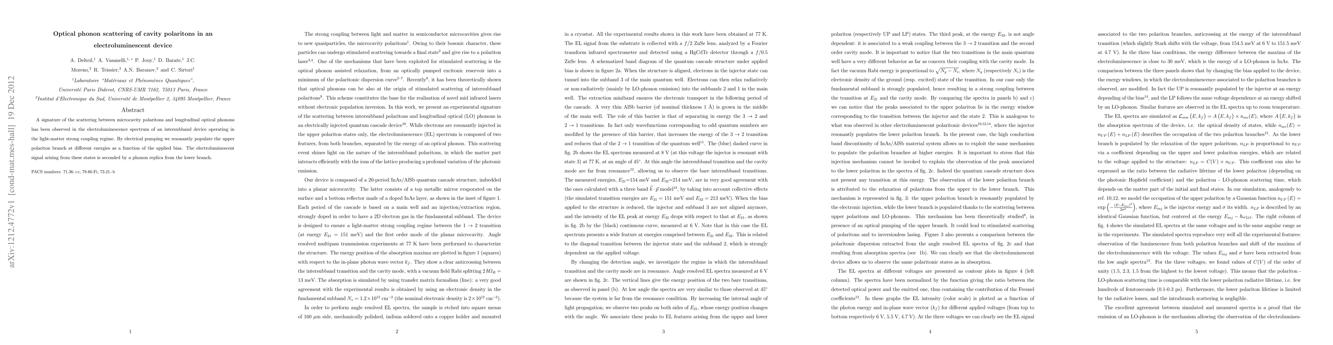 Summary: The study observes optical phonon scattering in microcavity polaritons within an electroluminescent device, revealing a signature in the electroluminescence spectrum through electrical pumping in the strong coupling regime, accompanied by a phonon replica from the lower polariton branch.