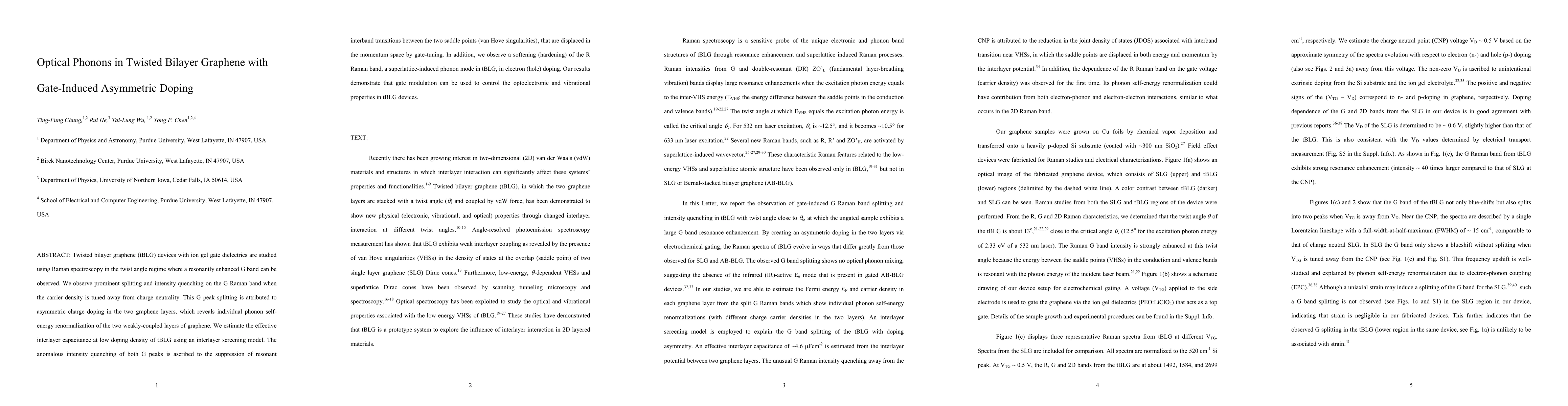 This study uses Raman spectroscopy to investigate optical phonons in twisted bilayer graphene (tBLG) under asymmetric doping induced by gate modulation. The research reveals significant G band splitting and intensity changes due to charge asymmetry, highlighting phonon self-energy renormalization and interlayer capacitance effects, while also observing phonon mode softening/hardening in response to electron/hole doping.