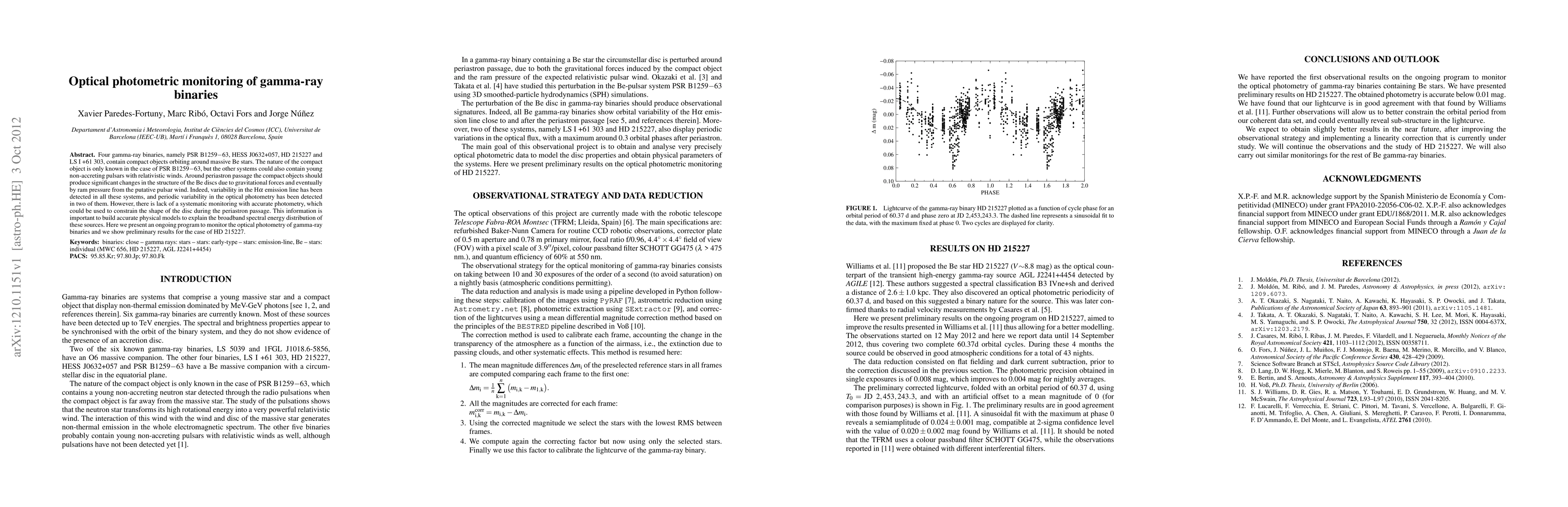 This paper details an ongoing optical photometric monitoring program for four gamma-ray binaries, focusing on the interaction between compact objects and massive Be stars. Preliminary results for HD 215227 highlight the need for systematic monitoring to better understand the disc's shape and the broadband spectral energy distribution during periastron passage.