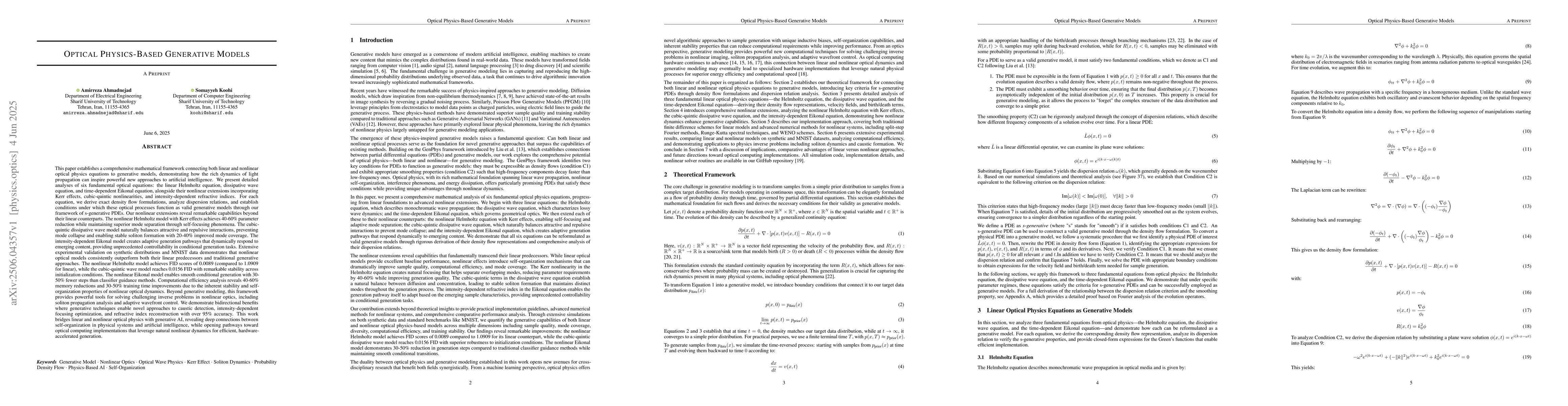 The paper establishes a comprehensive framework connecting optical physics equations to generative models, demonstrating how light propagation dynamics inspire powerful AI approaches.