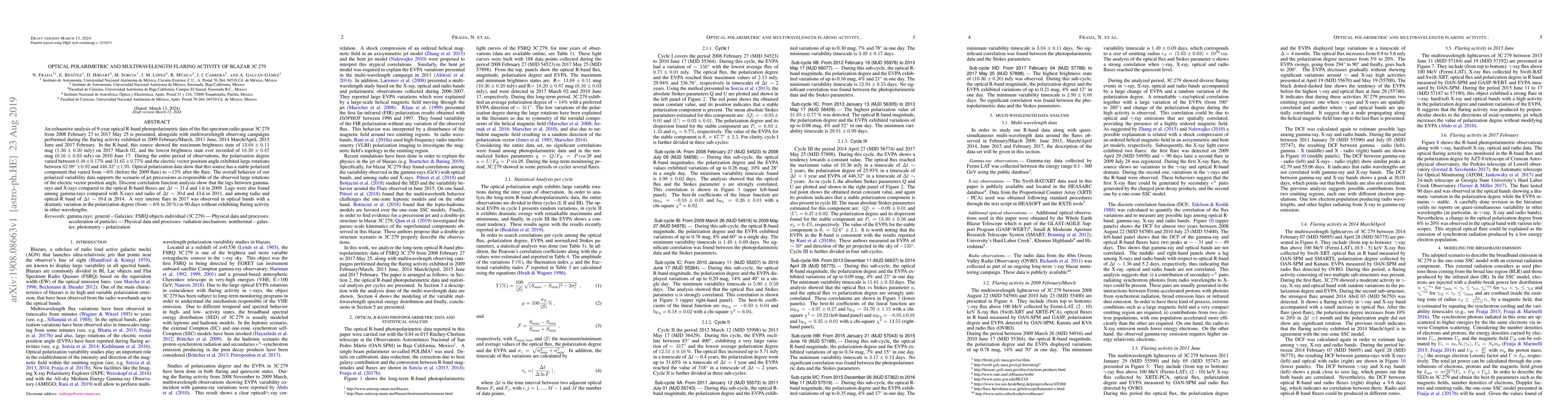 This paper analyzes 9 years of optical R-band photopolarimetric data and multiwavelength observations of the blazar 3C279, revealing significant brightness and polarization variations, including a record low brightness in 2010 and a maximum in 2017. The study supports jet precessions as a cause for large polarization angle rotations and identifies lags between different wavelengths during flaring activities.