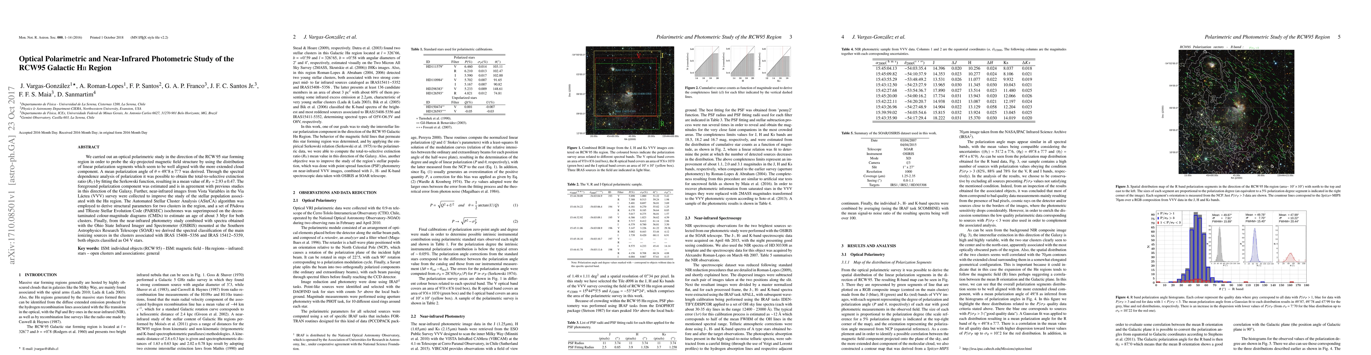 We carried out an optical polarimetric study in the direction of the RCW95 star forming region in order to probe the sky-projected magnetic field structure by using the distribution of linear polarization segments which seem to be well aligned with the more extended cloud component. A mean polarization angle of $\theta=49.8^o\pm7.7^o$ was derived. Through the spectral dependence analysis of polarization it was possible to obtain the total-to-selective extinction ratio ($R_V$) by fitting the Serkowski function, resulting in a mean value of $R_V=2.93\pm0.47$. The foreground polarization component was estimated and is in agreement with previous studies in this direction of the Galaxy. Further, near-infrared images from Vista Variables in the Via L\'actea (VVV) survey were collected to improve the study of the stellar population associated with the HII region. The Automated Stellar Cluster Analysis (ASteCA) algorithm was employed to derive structural parameters for two clusters in the region, and a set of PAdova and TRieste Stellar Evolution Code (PARSEC) isochrones was superimposed on the decontaminated colour-magnitude diagrams (CMDs) to estimate an age of about 3 Myr for both clusters. Finally, from the near-infrared photometry study combined with spectra obtained with the Ohio State Infrared Imager and Spectrometer (OSIRIS) mounted at the Southern Astrophysics Research Telescope (SOAR) we derived the spectral classification of the main ionizing sources in the clusters associated with IRAS 15408$-$5356 and IRAS 15412$-$5359, both objects classified as O4 V stars.