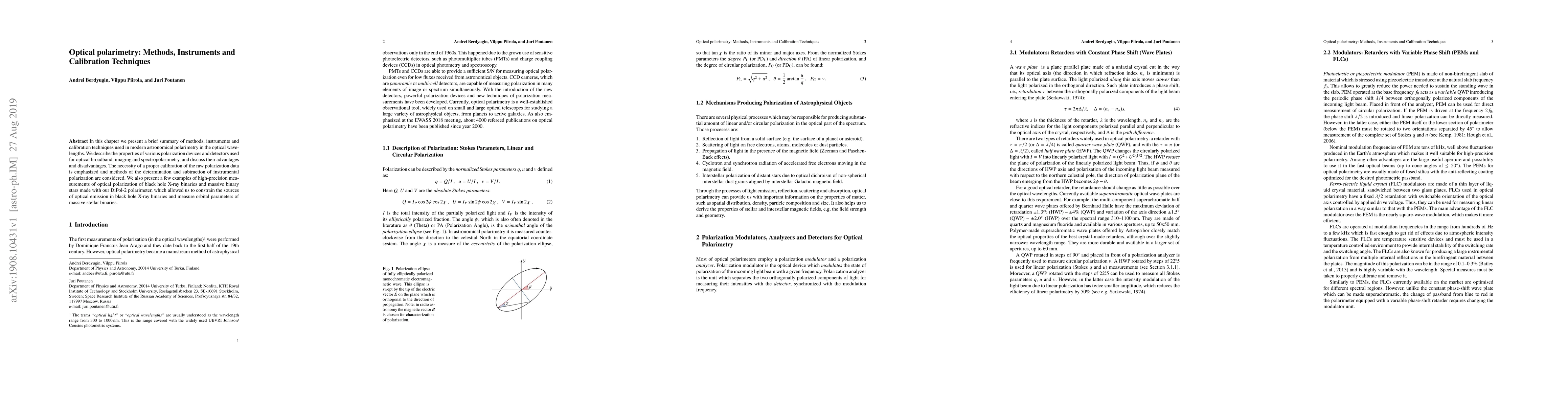 In this chapter we present a brief summary of methods, instruments and calibration techniques used in modern astronomical polarimetry in the optical wavelengths. We describe the properties of various polarization devices and detectors used for optical broadband, imaging and spectropolarimetry, and discuss their advantages and disadvantages. The necessity of a proper calibration of the raw polarization data is emphasized and methods of the determination and subtraction of instrumental polarization are considered. We also present a few examples of high-precision measurements of optical polarization of black hole X-ray binaries and massive binary stars made with our DiPol-2 polarimeter, which allowed us to constrain the sources of optical emission in black hole X-ray binaries and measure orbital parameters of massive stellar binaries.