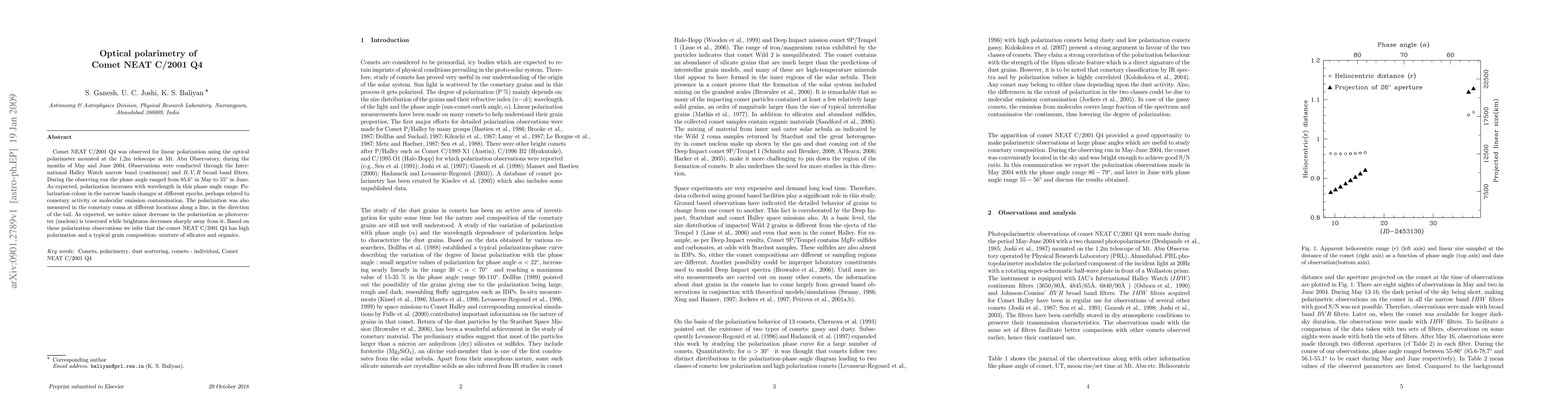 This study used optical polarimetry to observe Comet NEAT C/2001 Q4 in May and June 2004, finding that polarization increases with wavelength and varies with cometary activity. The comet's high polarization suggests a typical grain composition of silicates and organics.