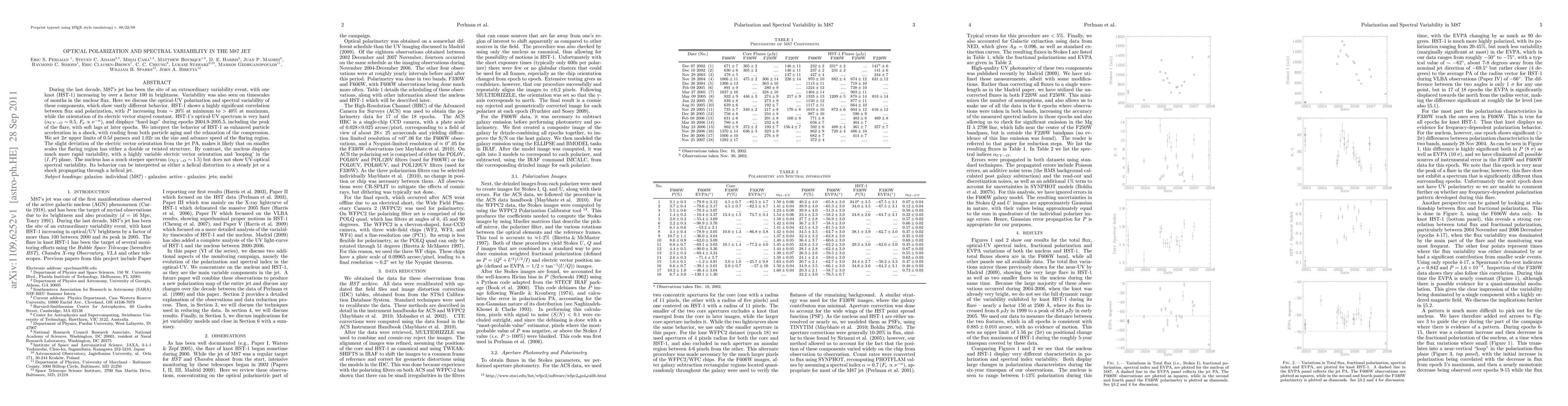 During the last decade, M87's jet has been the site of an extraordinary variability event, with one knot (HST-1) increasing by over a factor 100 in brightness. Variability was also seen on timescales of months in the nuclear flux. Here we discuss the optical-UV polarization and spectral variability of these components, which show vastly different behavior. HST-1 shows a highly significant correlation between flux and polarization, with P increasing from $\sim 20%$ at minimum to >40% at maximum, while the orientation of its electric vector stayed constant. HST-1's optical-UV spectrum is very hard ($\alpha_{UV-O}\sim0.5$, $F_\nu\propto\nu^{-\alpha}$), and displays "hard lags" during epochs 2004.9-2005.5, including the peak of the flare, with soft lags at later epochs. We interpret the behavior of HST-1 as enhanced particle acceleration in a shock, with cooling from both particle aging and the relaxation of the compression. We set 2$\sigma$ upper limits of $0.5 \delta$ parsecs and 1.02$c$ on the size and advance speed of the flaring region. The slight deviation of the electric vector orientation from the jet PA, makes it likely that on smaller scales the flaring region has either a double or twisted structure. By contrast, the nucleus displays much more rapid variability, with a highly variable electric vector orientation and 'looping' in the $(I,P)$ plane. The nucleus has a much steeper spectrum ($\alpha_{UV-O} \sim 1.5$) but does not show UV-optical spectral variability. Its behavior can be interpreted as either a helical distortion to a steady jet or a shock propagating through a helical jet.