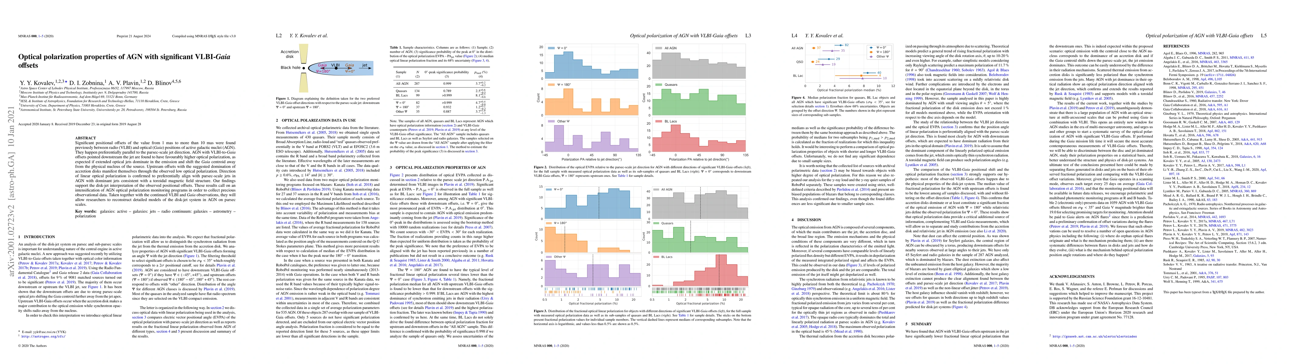 Significant positional offsets of the value from 1 mas to more than 10 mas were found previously between radio (VLBI) and optical (Gaia) positions of active galactic nuclei (AGN). They happen preferentially parallel to the parsec-scale jet direction. AGN with VLBI-to-Gaia offsets pointed downstream the jet are found to have favourably higher optical polarization, as expected if extended optical jets dominate in the emission and shift the Gaia centroid away from the physical nucleus of the source. Upstream offsets with the suggested domination of accretion disks manifest themselves through the observed low optical polarization. Direction of linear optical polarization is confirmed to preferentially align with parsec-scale jets in AGN with dominant jets consistent with a toroidal magnetic field structure. Our findings support the disk-jet interpretation of the observed positional offsets. These results call on an intensification of AGN optical polarization monitoring programs in order to collect precious observational data. Taken together with the continued VLBI and Gaia observations, they will allow researchers to reconstruct detailed models of the disk-jet system in AGN on parsec scales.