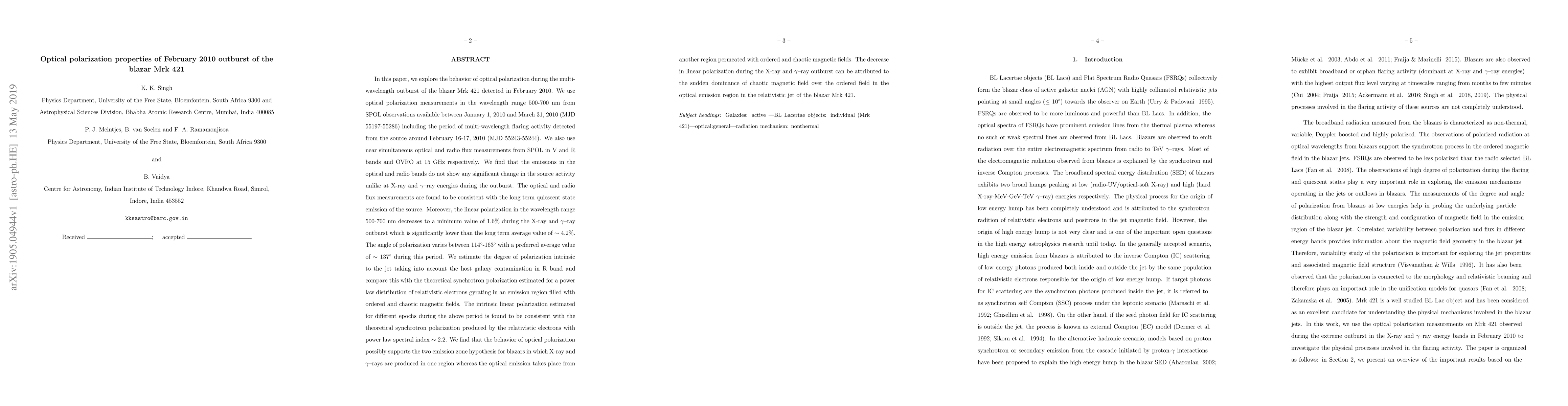 During a 2010 blazar outburst, optical polarization measurements revealed minimal changes in source activity compared to X-ray and gamma-ray energies, with linear polarization decreasing to 1.6% during the peak.