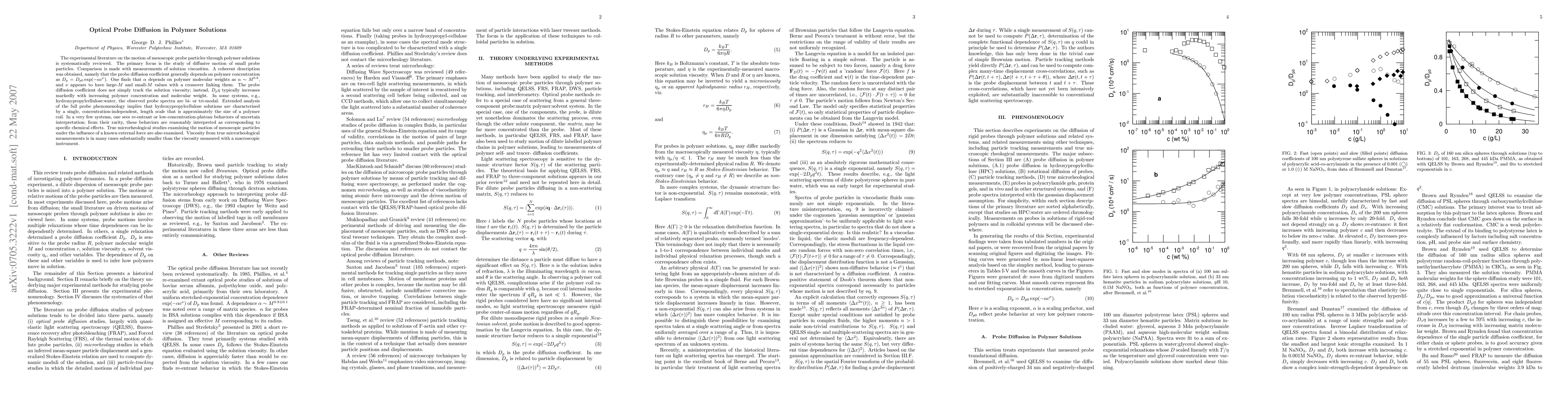 This paper reviews the diffusion of mesoscopic probe particles in polymer solutions, finding that probe diffusion depends on polymer concentration and molecular weight, and does not directly correlate with solution viscosity. The study identifies distinct behaviors in certain systems, such as bi-modal probe spectra in hydroxypropylcellulose:water solutions, suggesting a single polymer coil length scale.