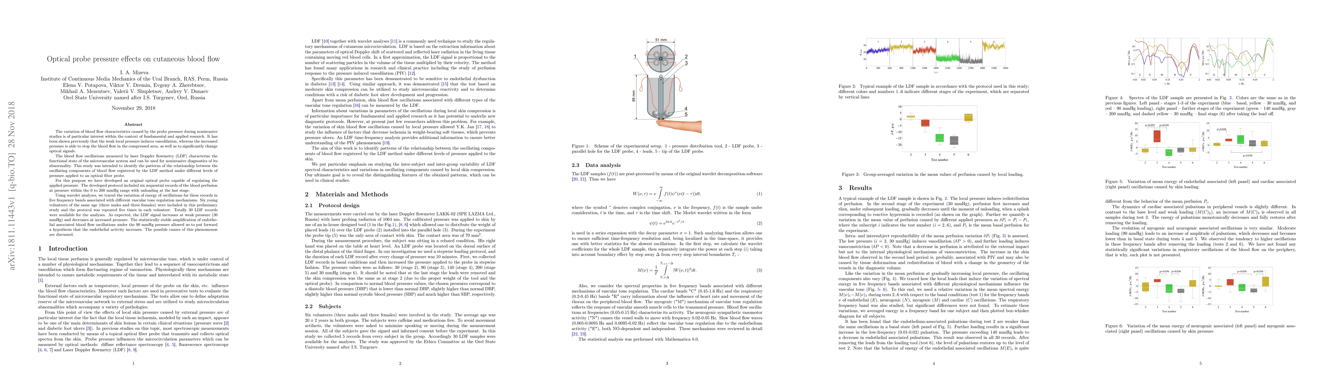 The variation of blood flow characteristics caused by the probe pressure during noninvasive studies is of particular interest within the context of fundamental and applied research. It has been shown previously that the weak local pressure induces vasodilation, whereas the increased pressure is able to stop the blood flow in the compressed area, as well as to significantly change optical signals. The blood flow oscillations measured by laser Doppler flowmetry (LDF) characterize the functional state of the microvascular system and can be used for noninvasive diagnostics of its abnormality. This study was intended to identify the patterns of the relationship between the oscillating components of blood flow registered by the LDF method under different levels of pressure applied to an optical fiber probe. For this purpose we have developed an original optical probe capable of regulating the applied pressure. The developed protocol included six sequential records of the blood perfusion at pressure within the 0 to 200 mmHg range with unloading at the last stage. Using wavelet analyses, we traced the variation of energy of oscillations for these records in five frequency bands associated with different vascular tone regulation mechanisms. Six young volunteers of the same age (three males and three females) were included in this preliminary study and the protocol was repeated five times in each volunteer. Totally 30 LDF records were available for the analyses. As expected, the LDF signal increases at weak pressure (30 mmHg) and decreases at increased pressure. The statistically stable amplification of endothelial associated blood flow oscillations under the 90 mmHg pressure allowed us to put forward a hypothesis that the endothelial activity increases. The possible causes of this phenomenon are discussed.