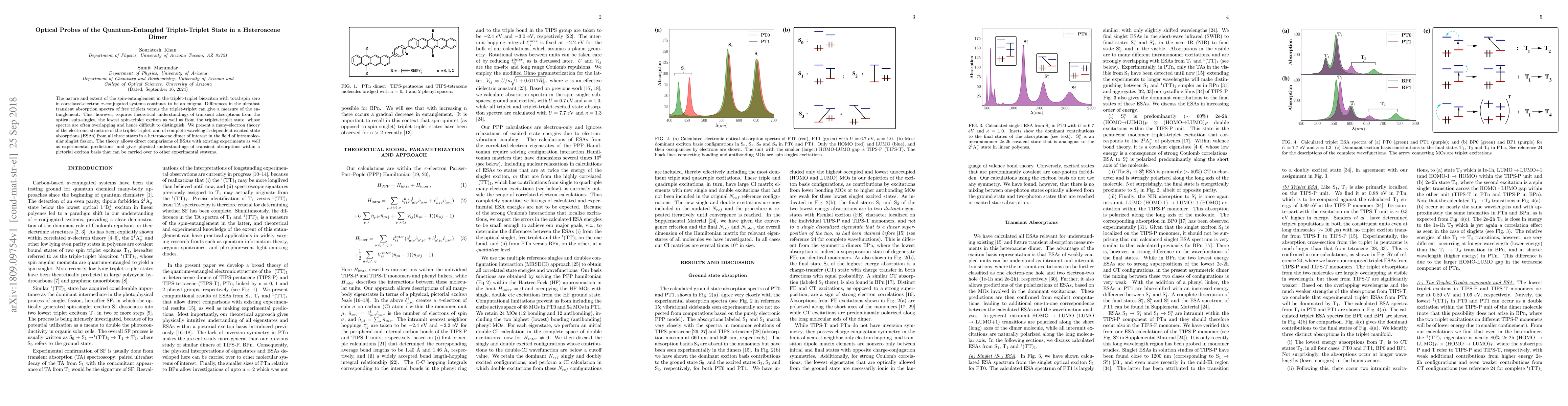 The nature and extent of the spin-entanglement in the triplet-triplet biexciton with total spin zero in correlated-electron $\pi$-conjugated systems continues to be an enigma. Differences in the ultrafast transient absorption spectra of free triplets versus the triplet-triplet can give a measure of the entanglement. This, however, requires theoretical understandings of transient absorptions from the optical spin-singlet, the lowest spin-triplet exciton as well as from the triplet-triplet state, whose spectra are often overlapping and hence difficult to distinguish. We present a many-electron theory of the electronic structure of the triplet-triplet, and of complete wavelength-dependent excited state absorptions (ESAs) from all three states in a heteroacene dimer of interest in the field of intramolecular singlet fission. The theory allows direct comparisons of ESAs with existing experiments as well as experimental predictions, and gives physical understandings of transient absorptions within a pictorial exciton basis that can be carried over to other experimental systems.