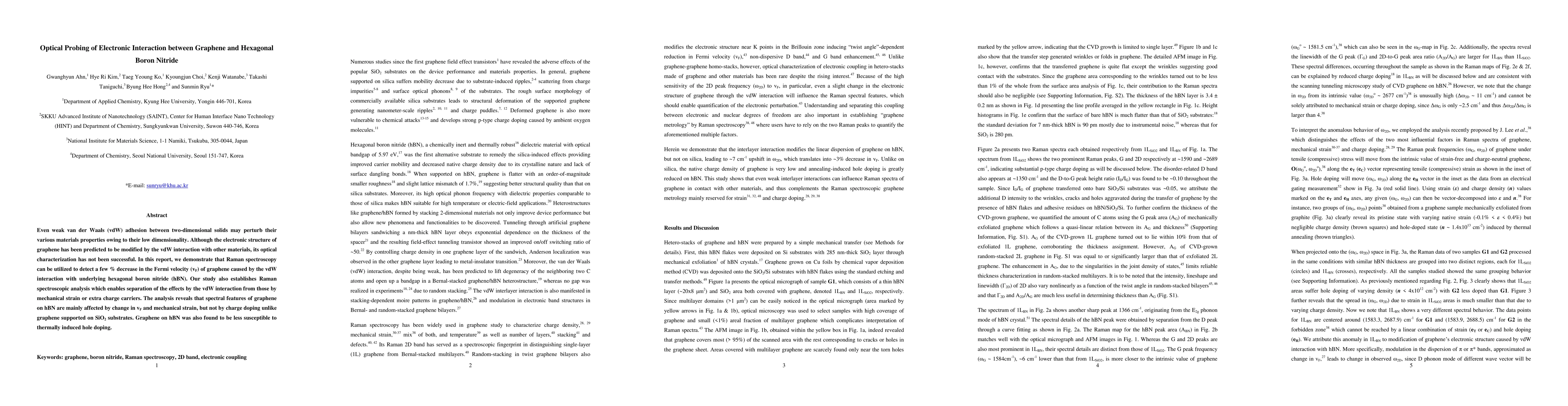 Even weak van der Waals (vdW) adhesion between two-dimensional solids may perturb their various materials properties owing to their low dimensionality. Although the electronic structure of graphene has been predicted to be modified by the vdW interaction with other materials, its optical characterization has not been successful. In this report, we demonstrate that Raman spectroscopy can be utilized to detect a few % decrease in the Fermi velocity (vF) of graphene caused by the vdW interaction with underlying hexagonal boron nitride (hBN). Our study also establishes Raman spectroscopic analysis which enables separation of the effects by the vdW interaction from those by mechanical strain or extra charge carriers. The analysis reveals that spectral features of graphene on hBN are mainly affected by change in vF and mechanical strain, but not by charge doping unlike graphene supported on SiO2 substrates. Graphene on hBN was also found to be less susceptible to thermally induced hole doping.