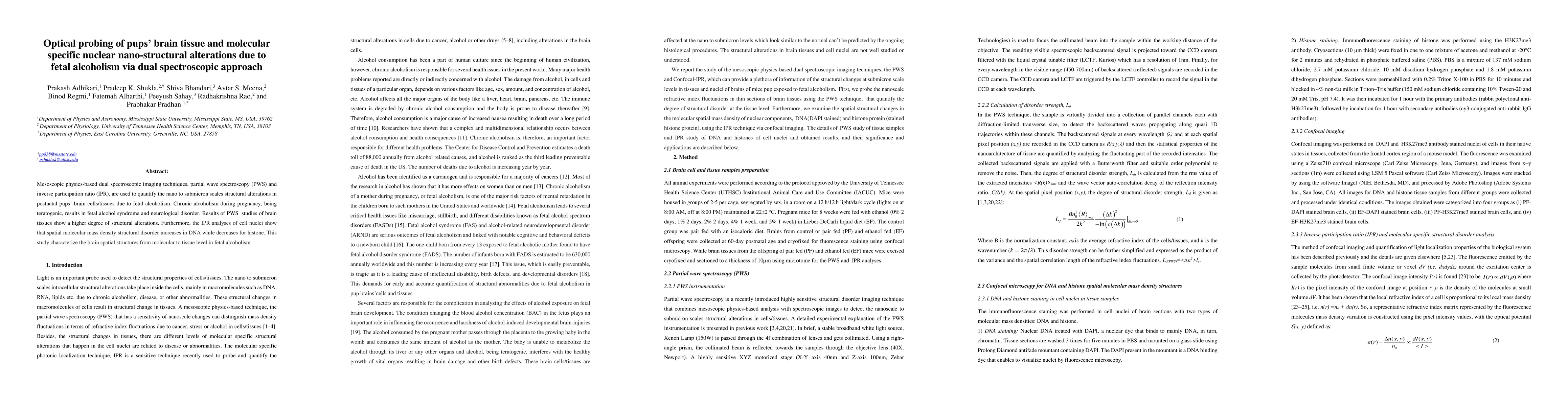 This study employs dual spectroscopic techniques to examine nano to submicron structural changes in postnatal pups' brain tissue due to fetal alcoholism, revealing increased molecular mass density disorder in DNA and decreased disorder in histones. The findings characterize brain spatial structures from molecular to tissue levels in fetal alcoholism.