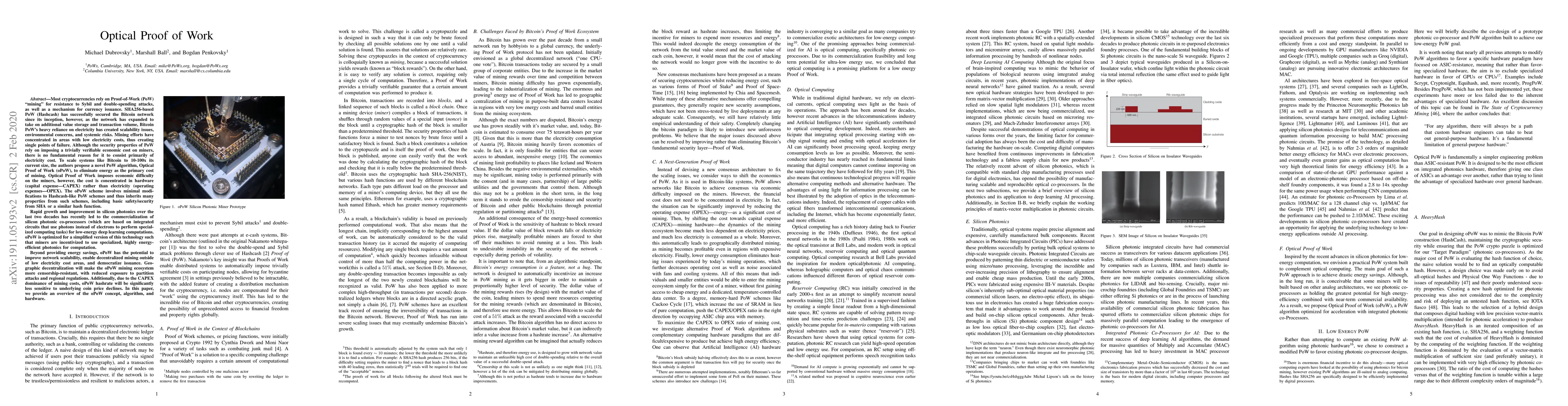 A new cryptocurrency proof-of-work algorithm, Optical Proof of Work (oPoW), is proposed to eliminate energy costs from mining, enabling decentralized and scalable networks with reduced environmental impact and systemic risks.