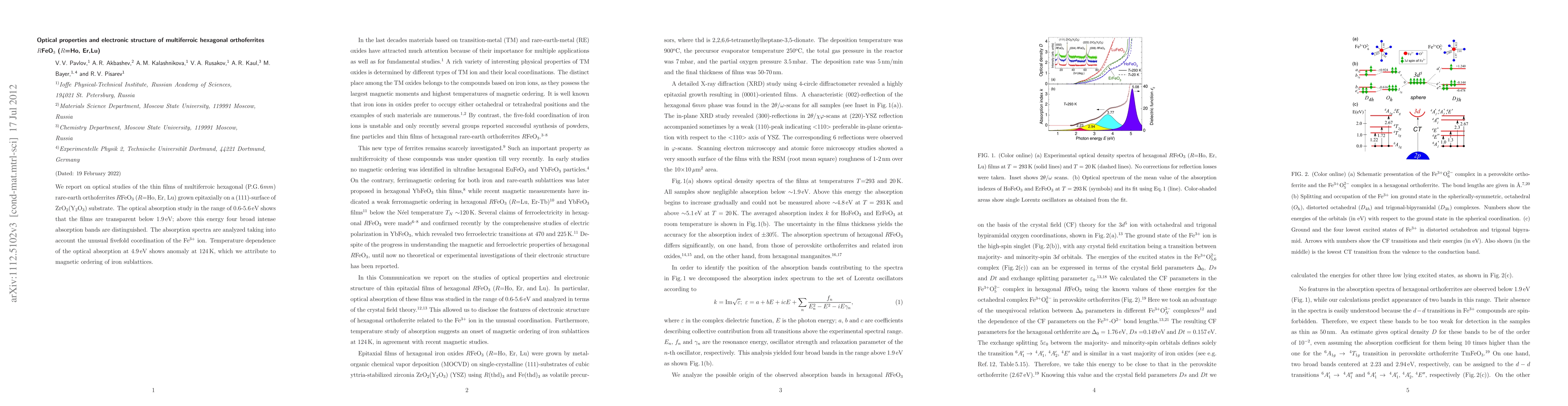 This study investigates the optical properties of thin films of multiferroic hexagonal RFeO3 (R=Ho, Er, Lu) orthoferrites, revealing transparency below 1.9 eV and four intense absorption bands above this energy. An anomaly in optical absorption at 4.9 eV at 124 K indicates magnetic ordering in the iron sublattices.